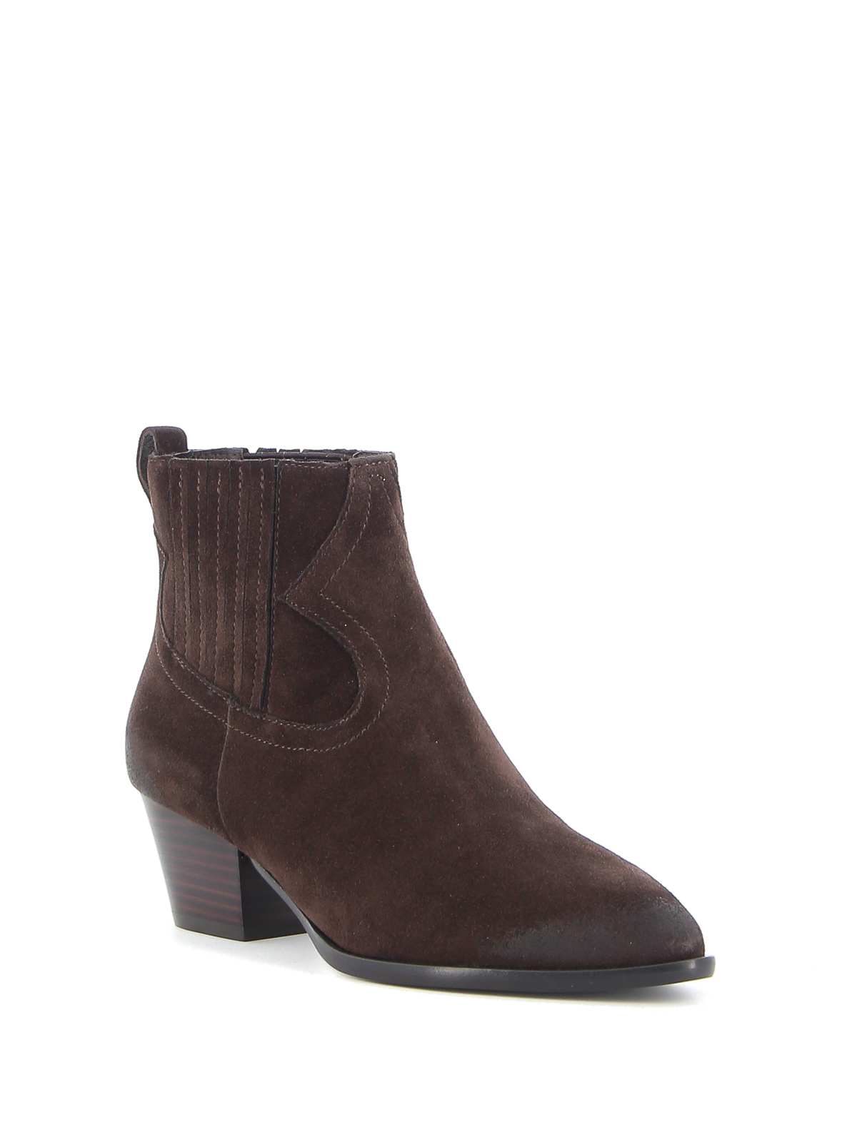 Suede ankle boots featuring elasticated side inserts, back pull loop, vintage effect pointed toe and block heel.