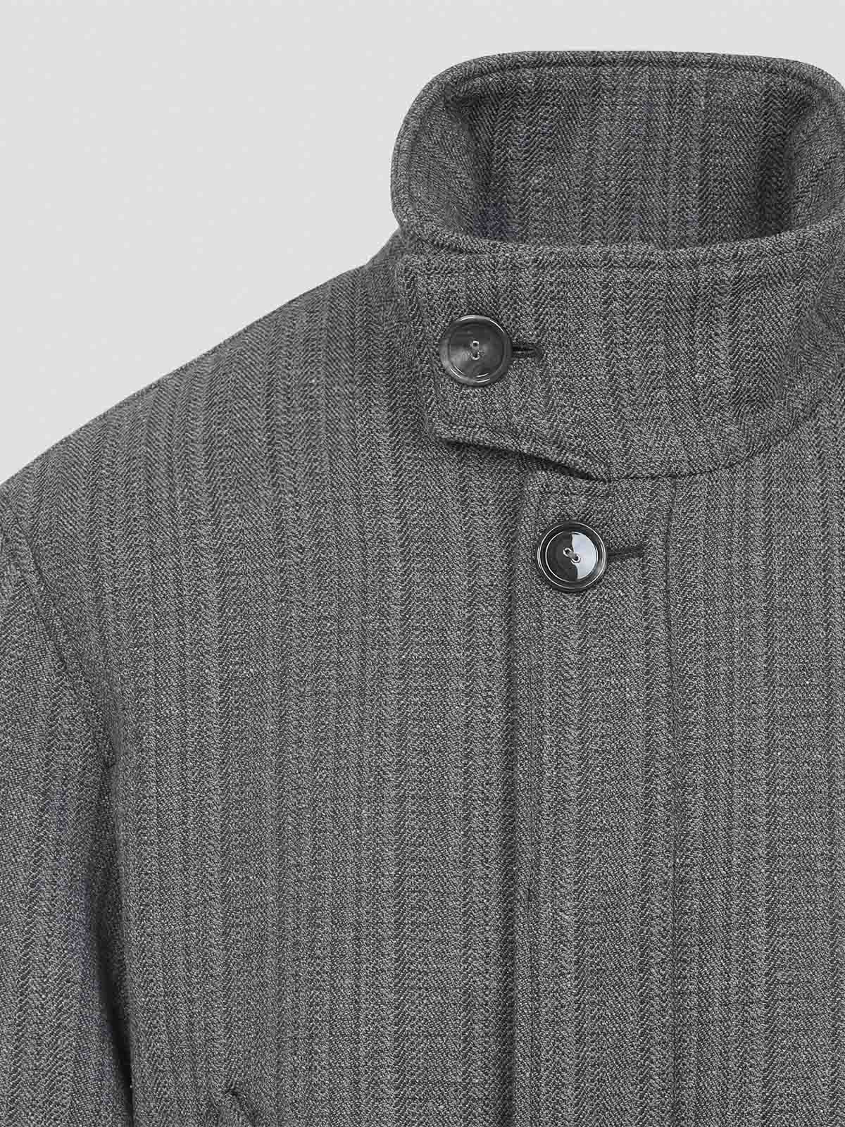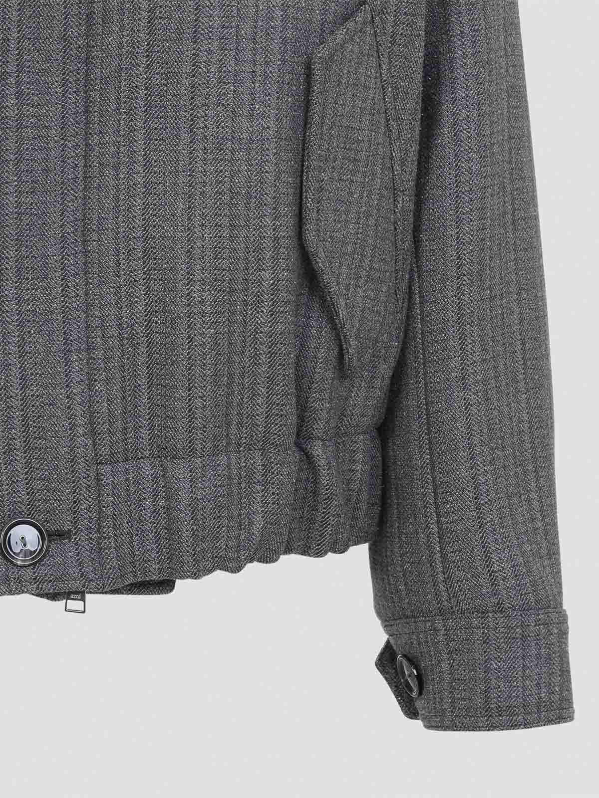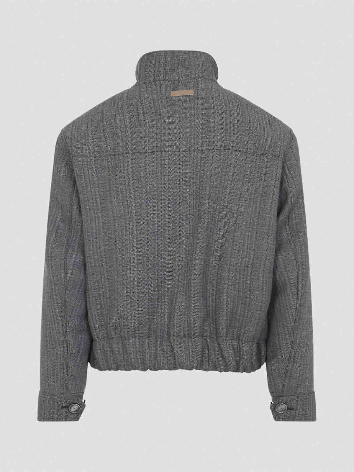 Ami harrington grey jacket crafted from herringbone grey and blend standing collar with button concealed button and zip flap pockets branded label at the back yoke long sleeves with buttoned cuffs elastic hem padded and lined
