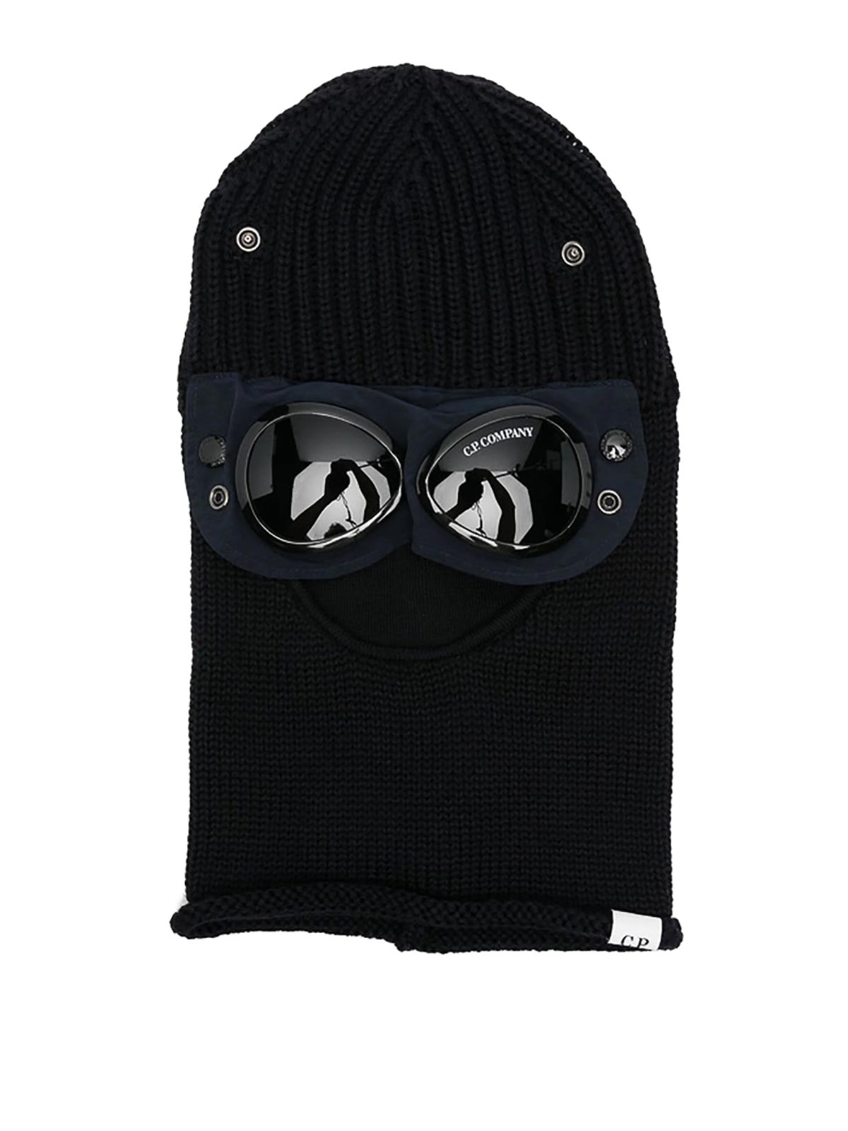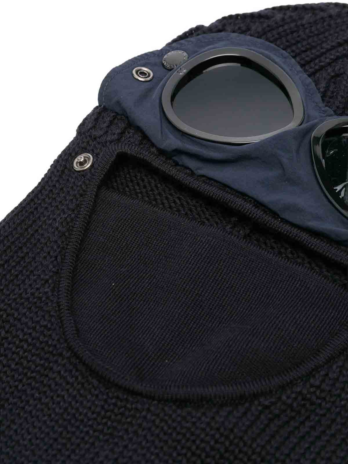 Dark blue wool knit integrated goggles snap button fastening ribbed texture c.p. company suggests removing any detachable accessories before washing.