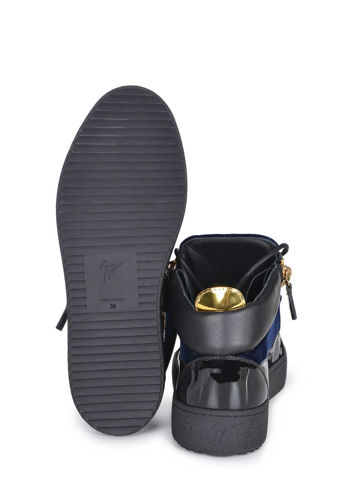Giuseppe zanotti high-top sneakers kriss made of black leather. blue velvet inserts. round toe. gold metal signature on the tongue. laced. tone-on-tone laces. closure with coated metal zip on the sides. black rubber sole. imprinted logo on the back. sole 100% rubber. 100% leather. made in italy.