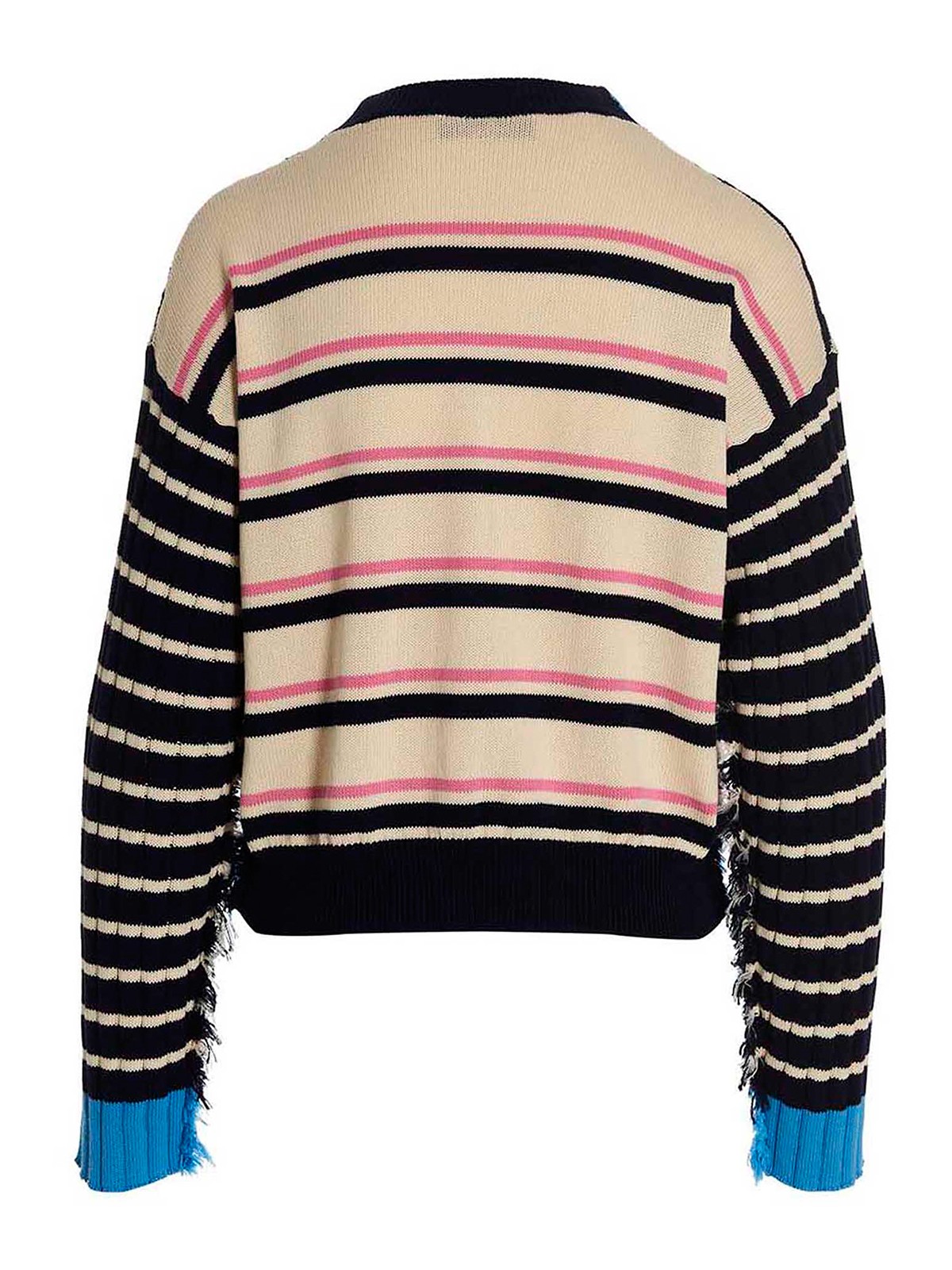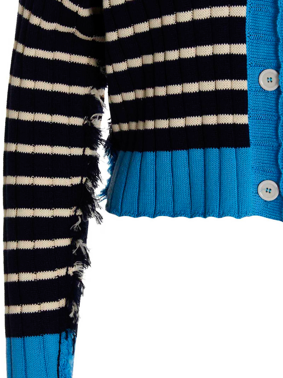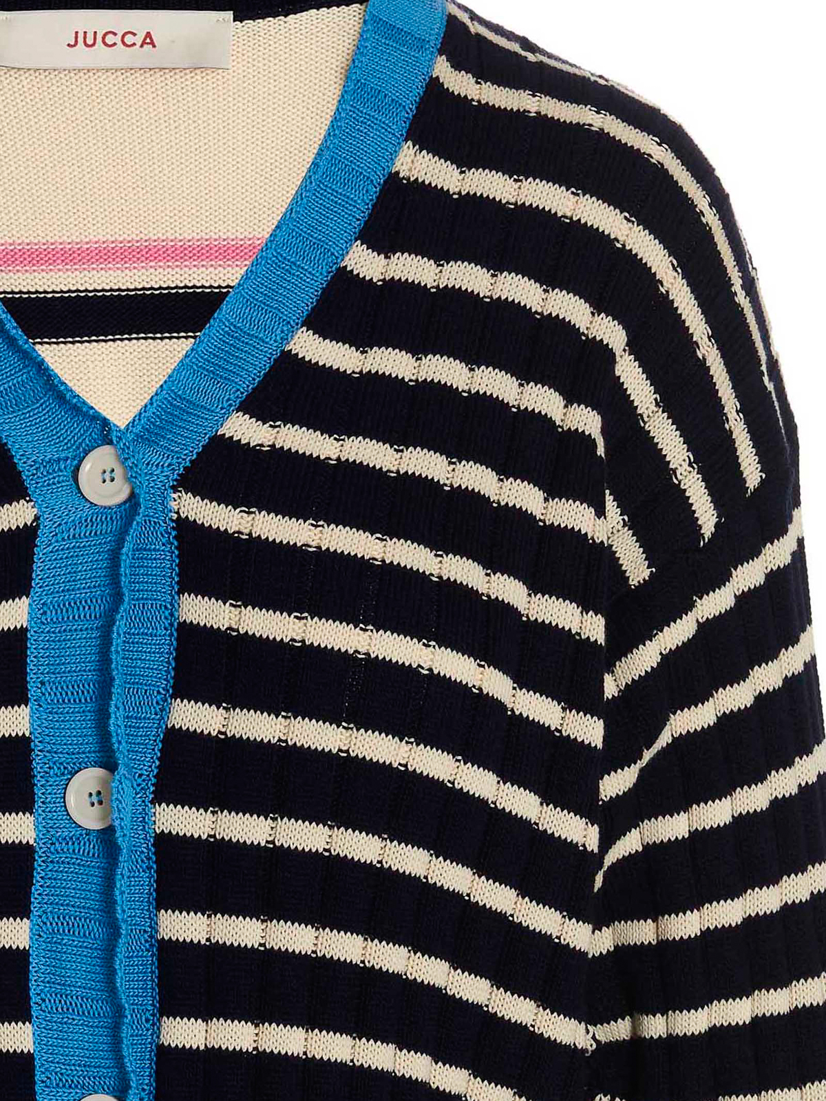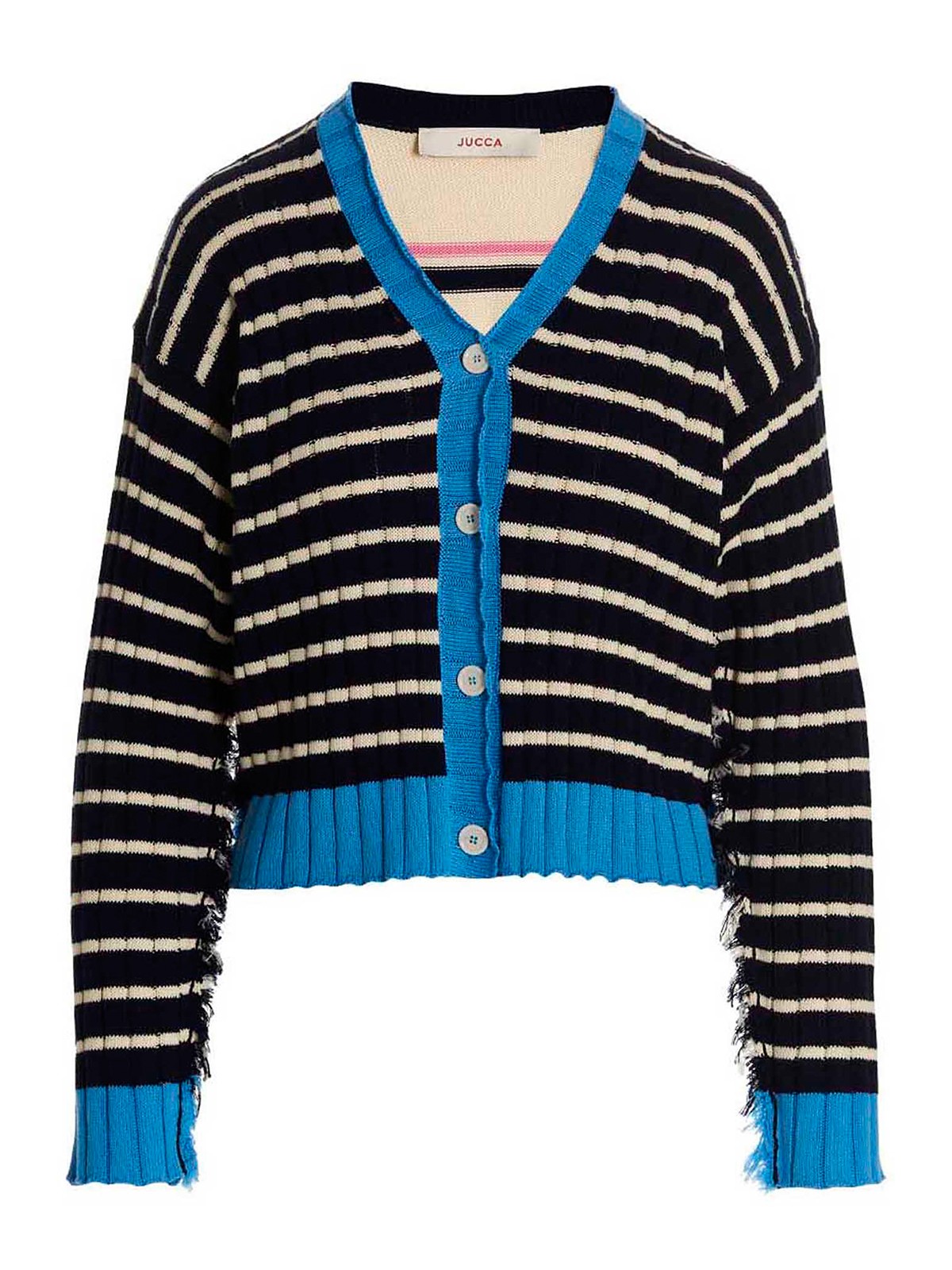Horizontal striped cardigan with contrast edging, frayed edging, button closure and a v-neck.