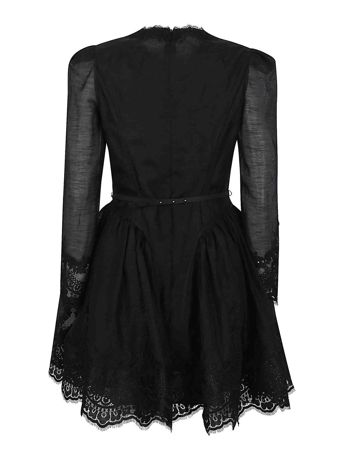 Hypnotic mini dress with lace trim in silk and linen by Zimmermann, rounded neckline, long sleeves, gathered shoulders, invisible zipper at the center back, full flared skirt with tulle inserts for volume, embellished with lace trim on the neckline, cuffs, and hem, and a removable, covered bow belt.