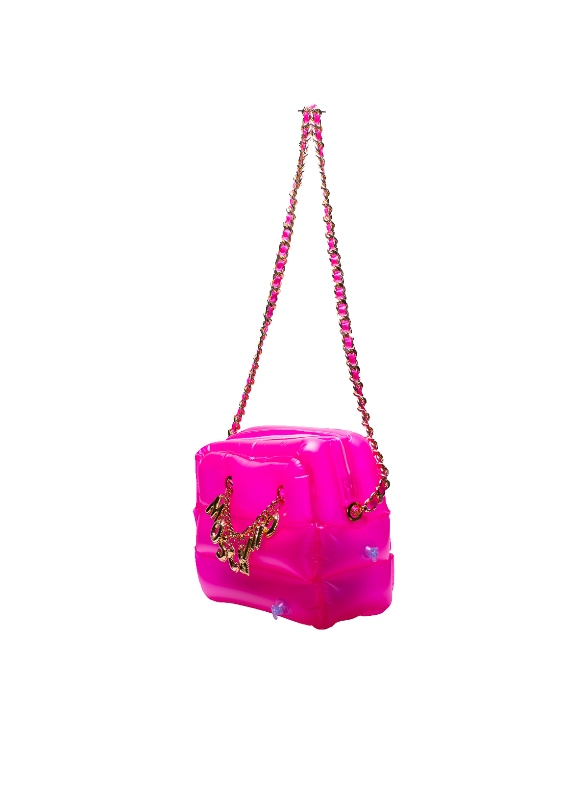 inflatable bag in pink crossbody bag in pvc fabric featuring inflatable elements that reminds the classic sea mattress metallic moschino logo lettering hanging charms in gold weaved strap runway piece dustbag pvc w h (no handles) d w h d inch