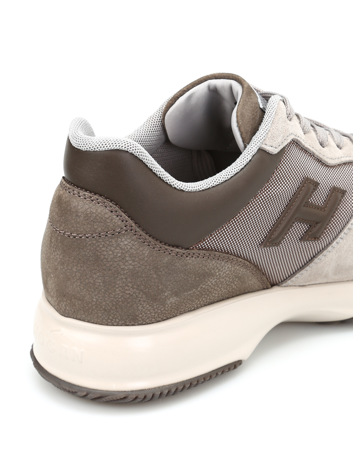 Leather trainers detailed with high-tech fabric inserts and a contrasting patent leather detail on heel, embossed H logo in suede, concealed wedge and rubber outer sole. Embossed logo on heel. These shoes are roomy: for a proper fitting please choose one size less than yours.