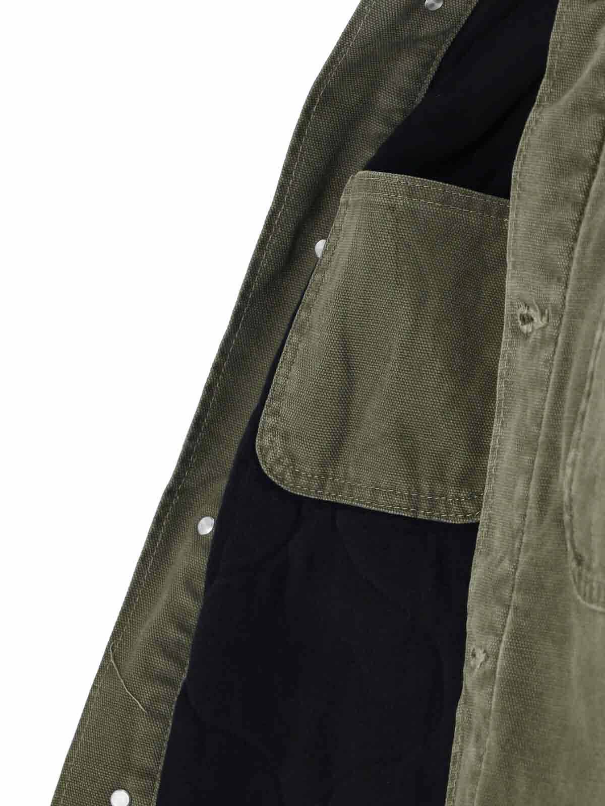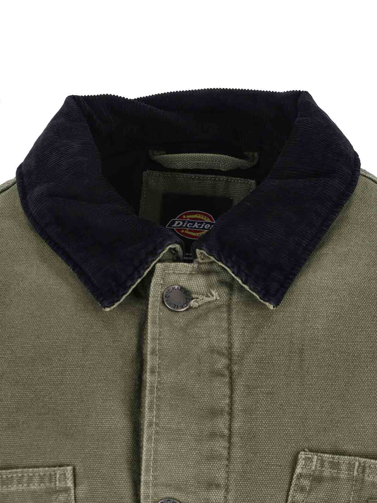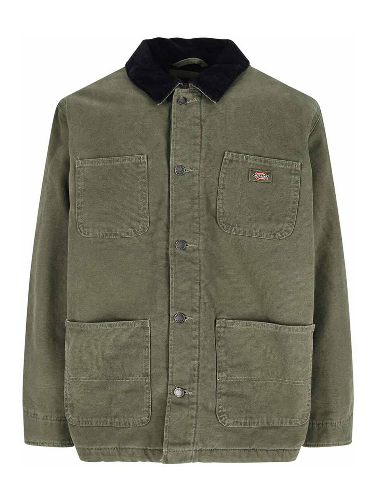 Dickies chore jacket, in green cotton, contrasting velvet collar, button closure, four front pockets, multicolor logo patch on the front, one internal flat pocket, buttoned cuffs, straight hem.