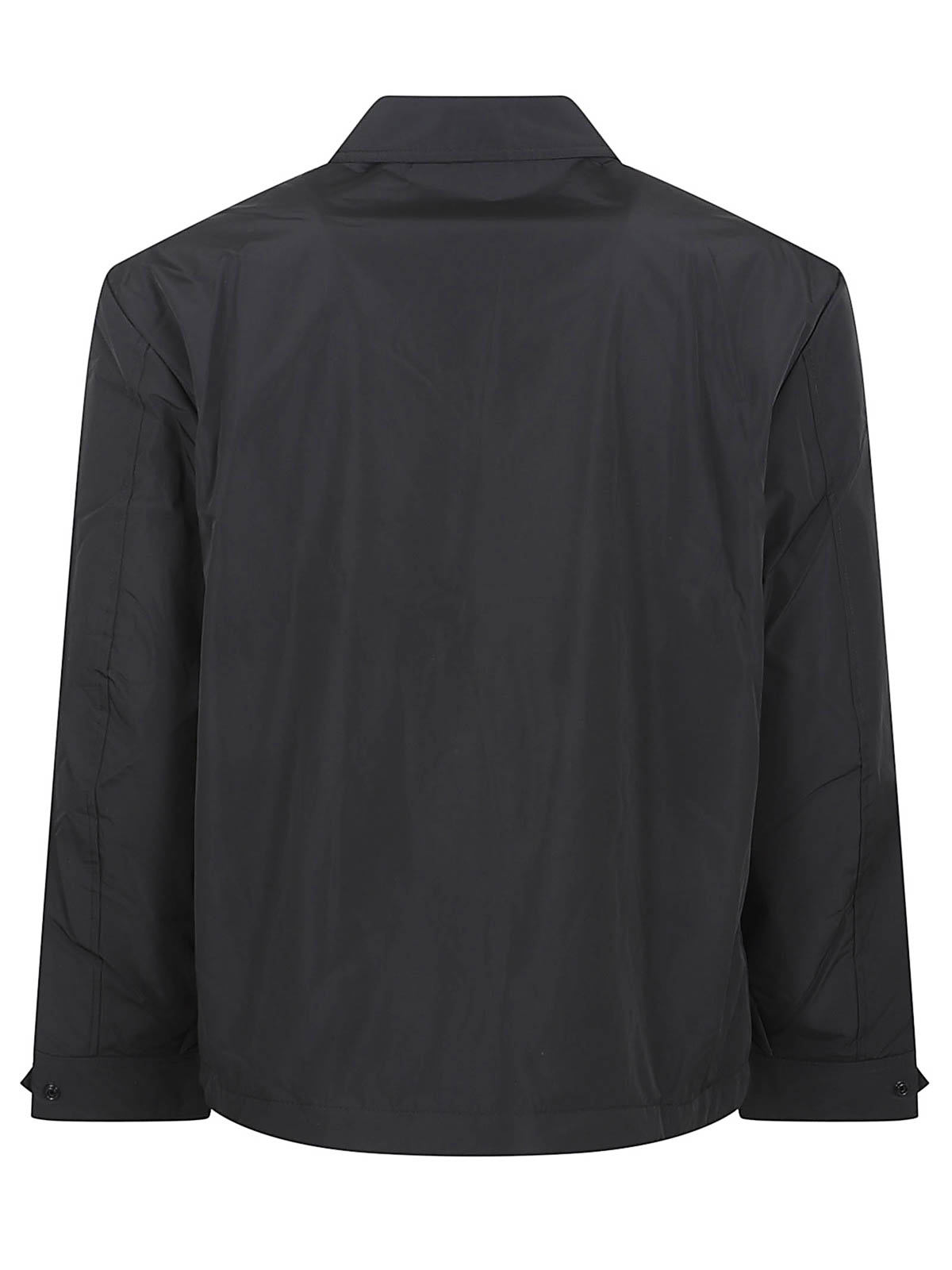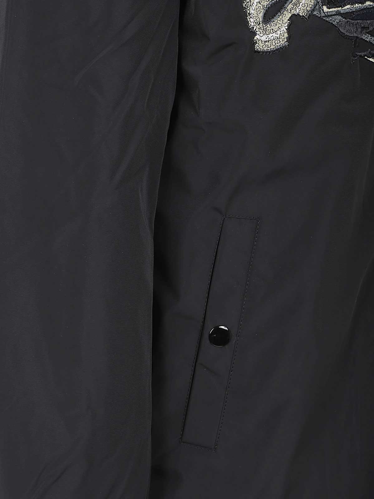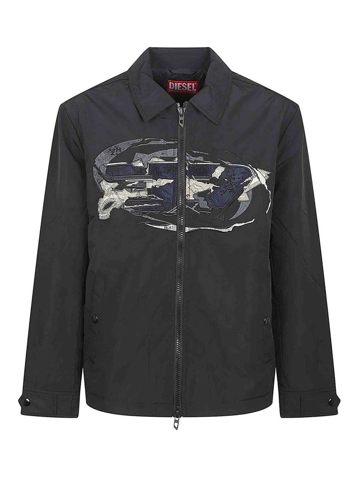 Diesel jacket with classic shirt collar, double-slider zip closure, two slanted pockets with button, long sleeves with adjustable cuffs. Featuring an exploded oval D logo on the front with a flocked graphic that mimics a worn look.
