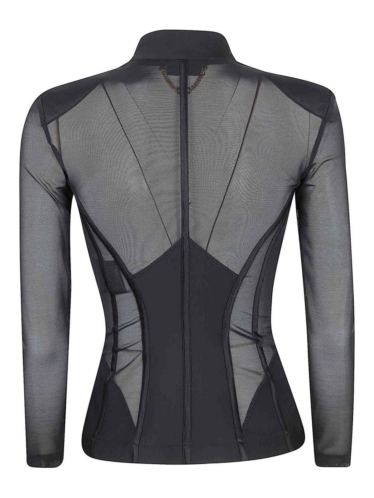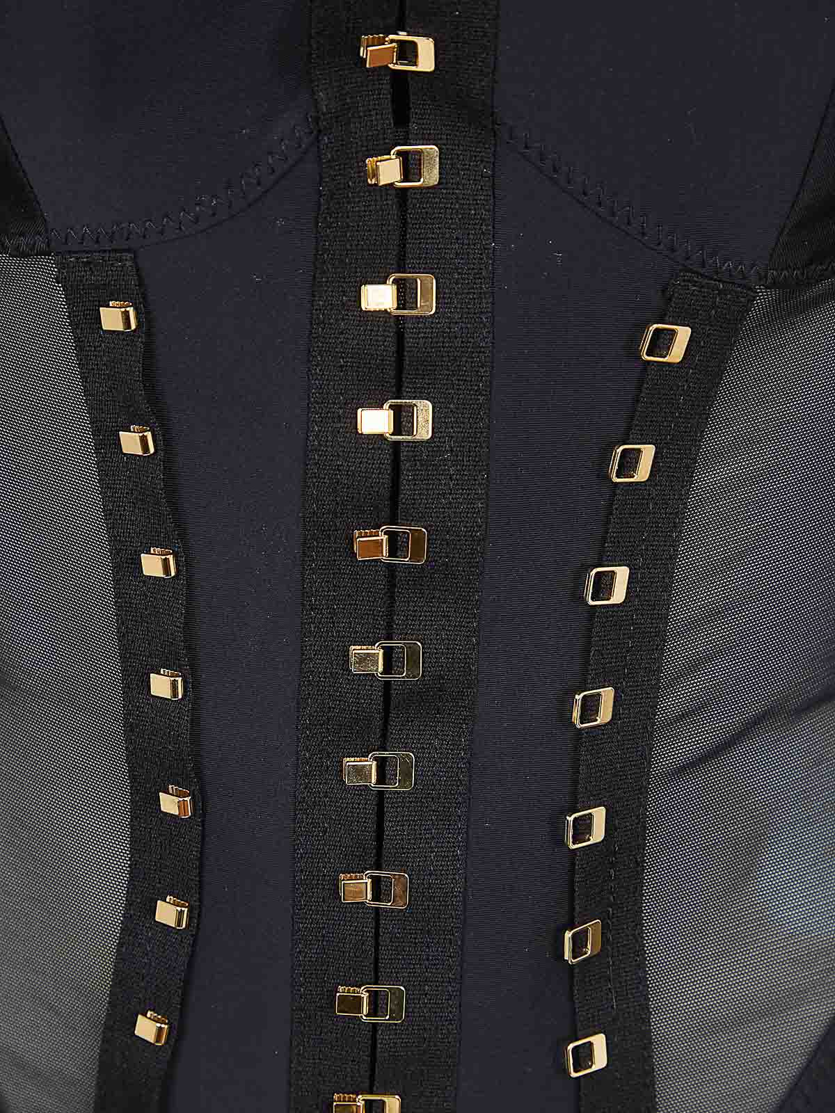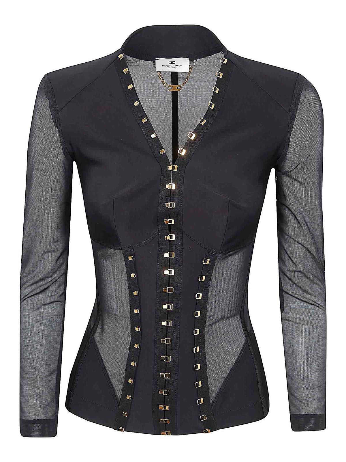 Bustier jacket in bi-elastic and tulle by Elisabetta Franchi, long sleeves, padded straps with hooks, design that follows the shape of the body, characterized by geometric cuts that sculpt the silhouette and the satin inserts enhance the play of transparency