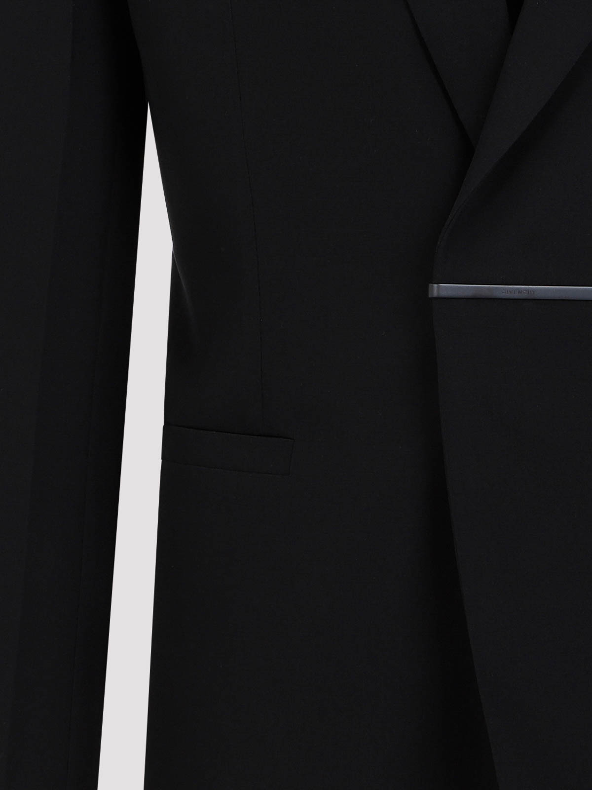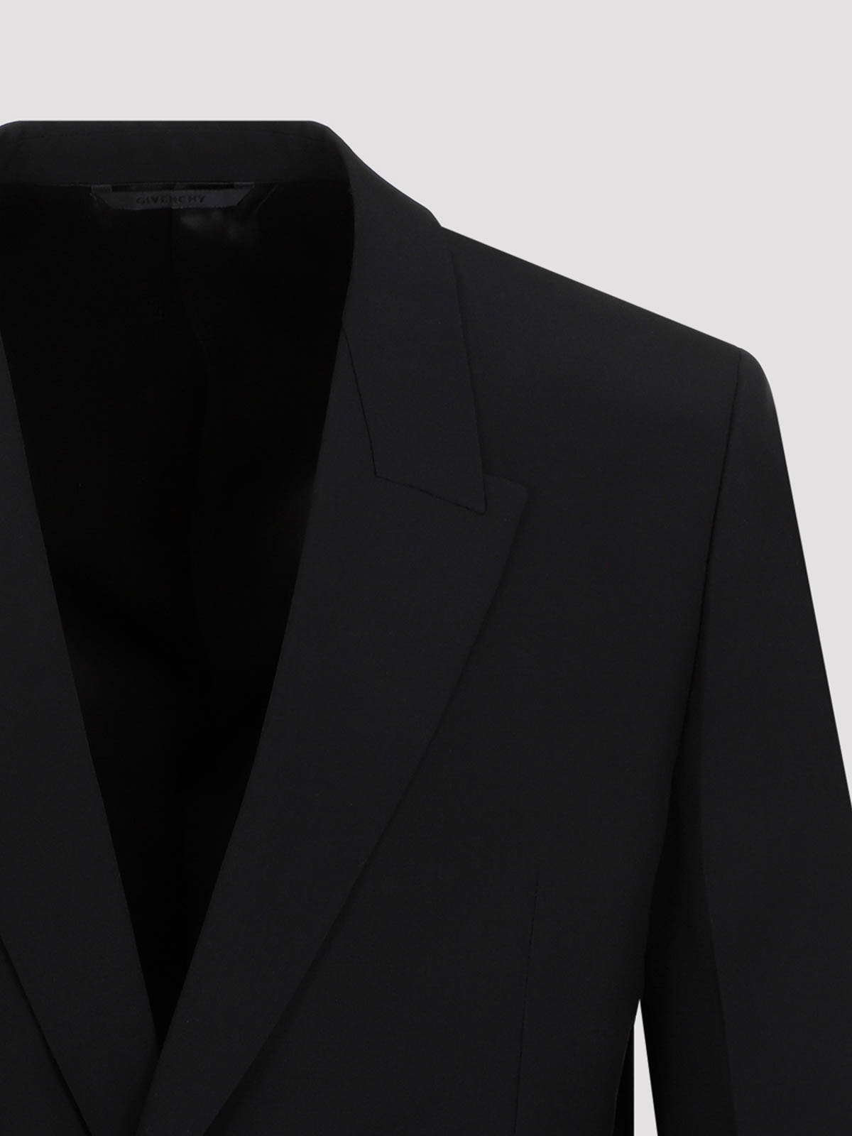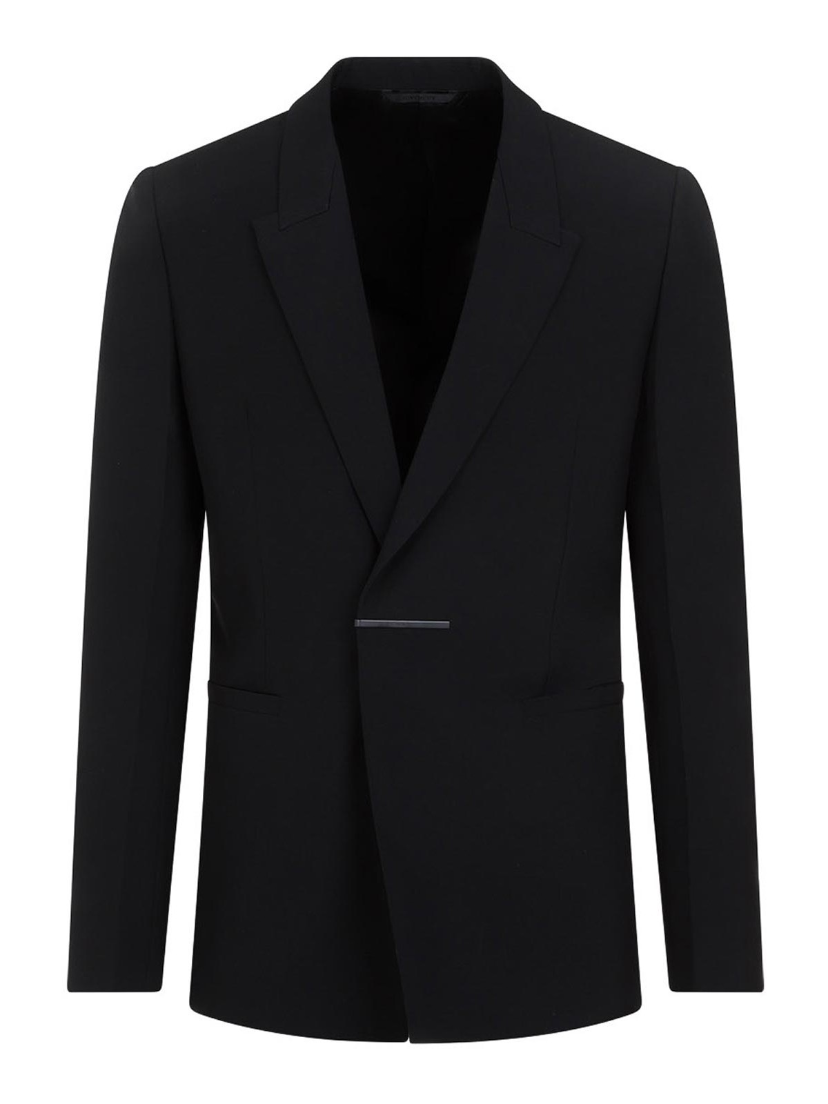 Givenchy black virgin wool jacket. pure black virgin wool jacket, notched collar, front silver-tone logoed metallic hook fastening, front slit pockets, long sleeves, buttoned cuffs, straight hem. fully lined.