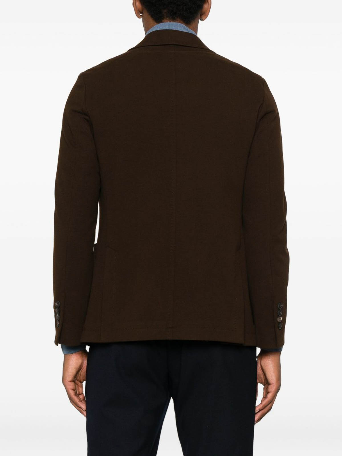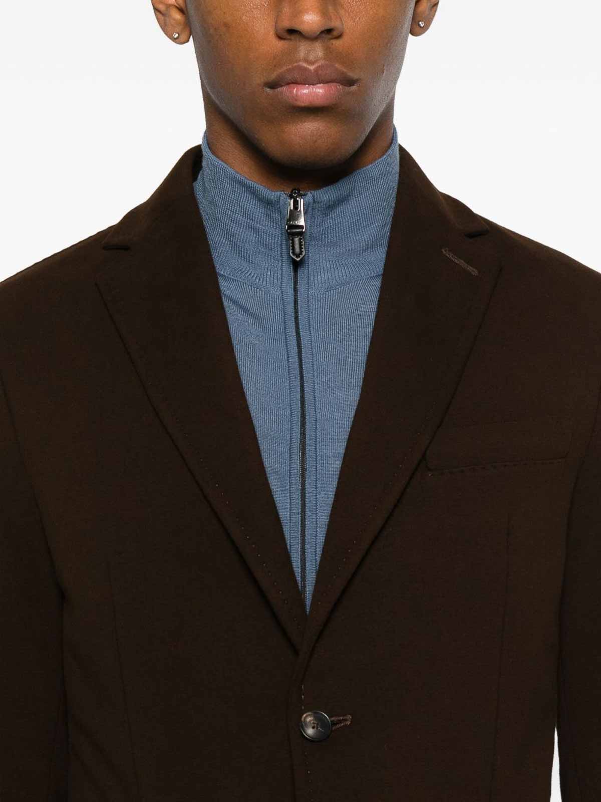 Features brown button placket, patch pockets, notch lapels, long sleeves, straight hem