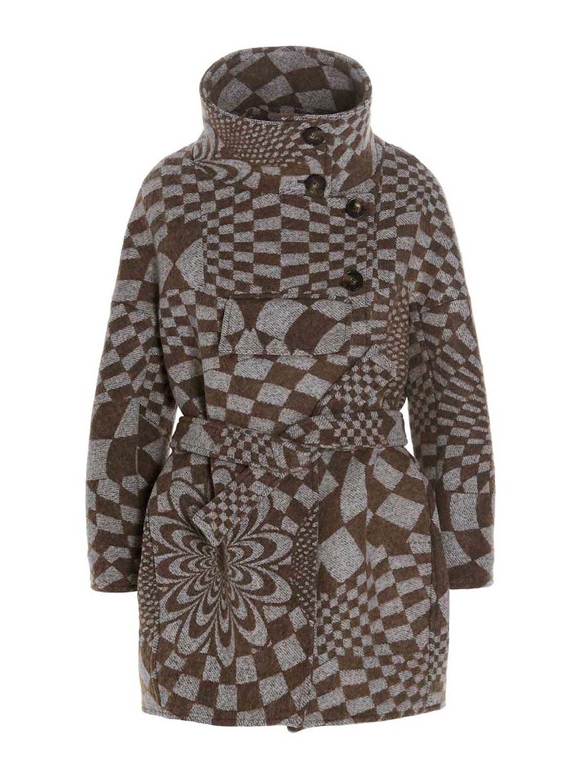 Jacquard wool coat with a high neck an asymmetric button closure and a half belt at the back