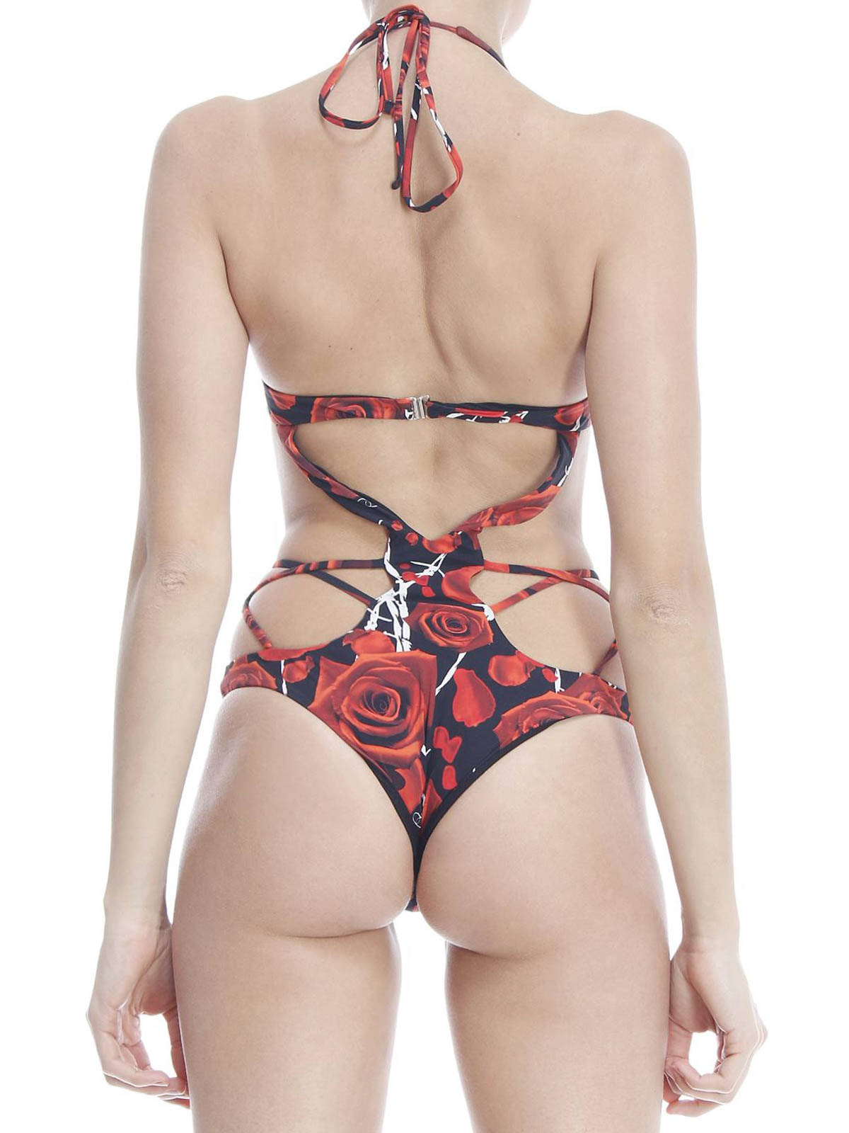 Monokini detailed with an all over rose pattern print, an unique cut, hook and lace fastening at back.