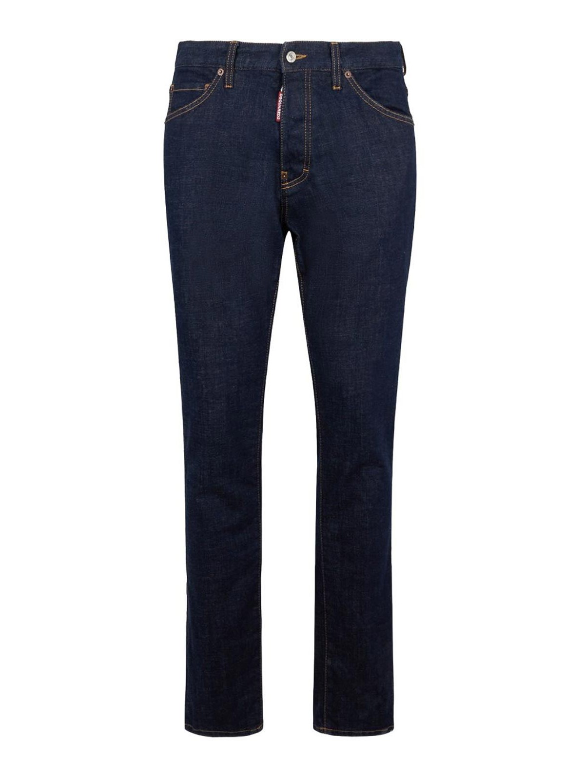 Dark rinse five pockets button belt loops rear logo patch tonal topstitching