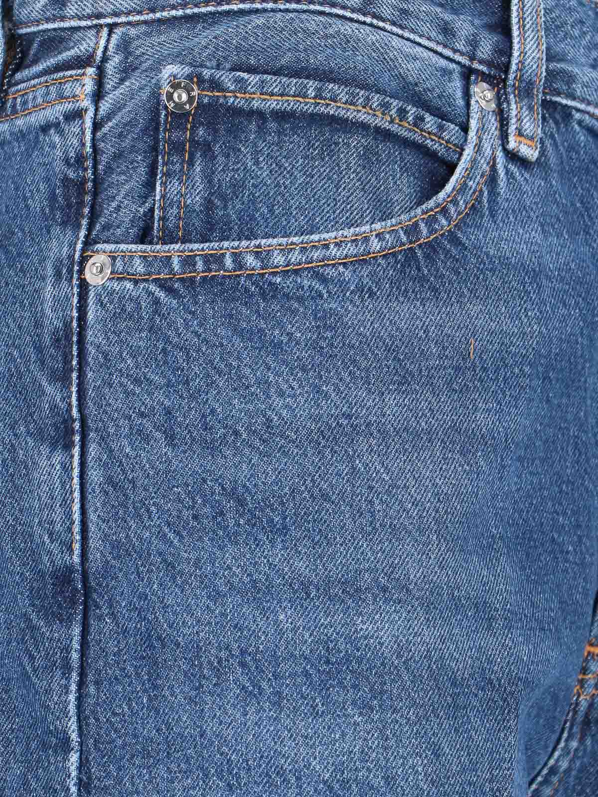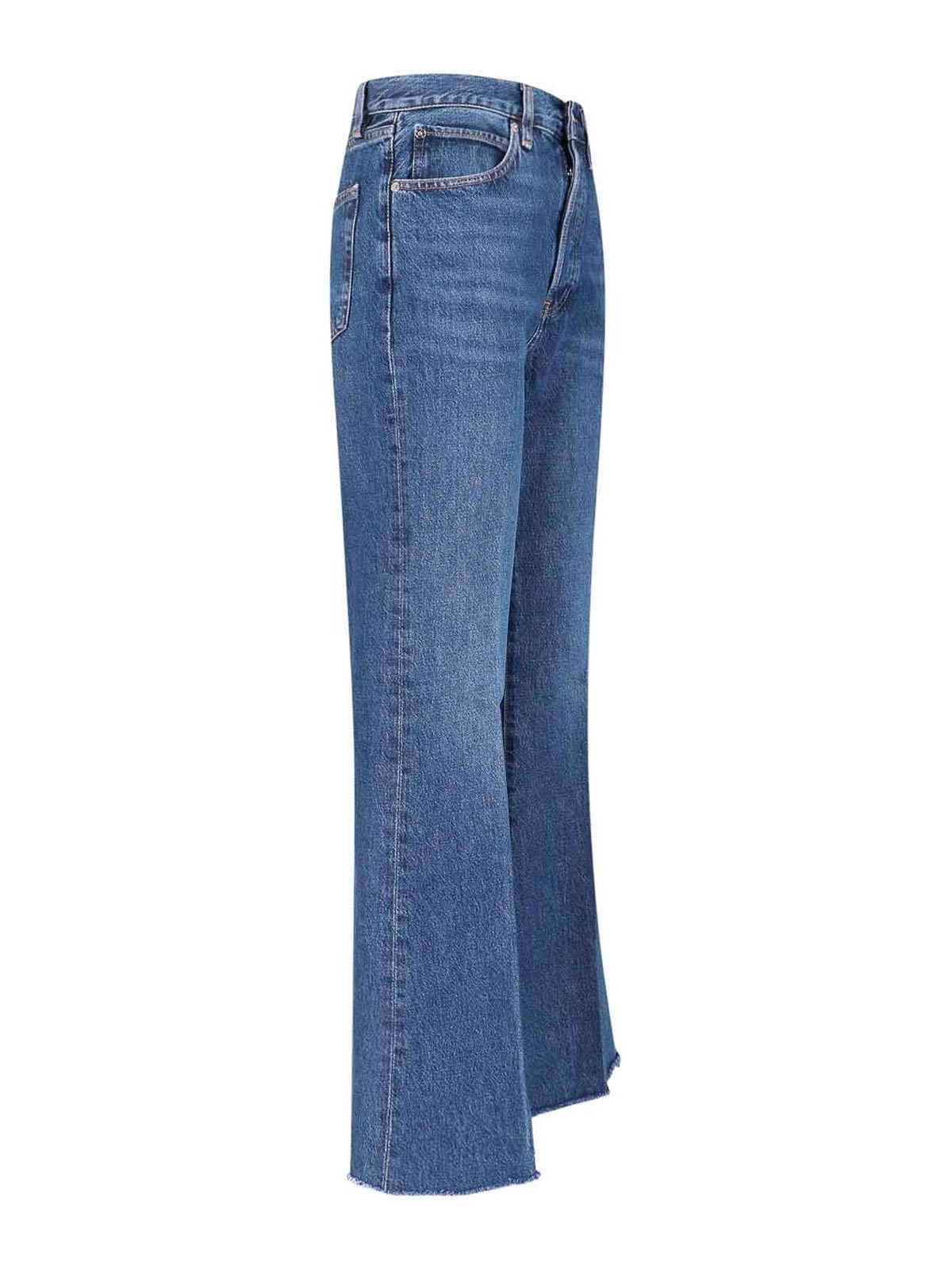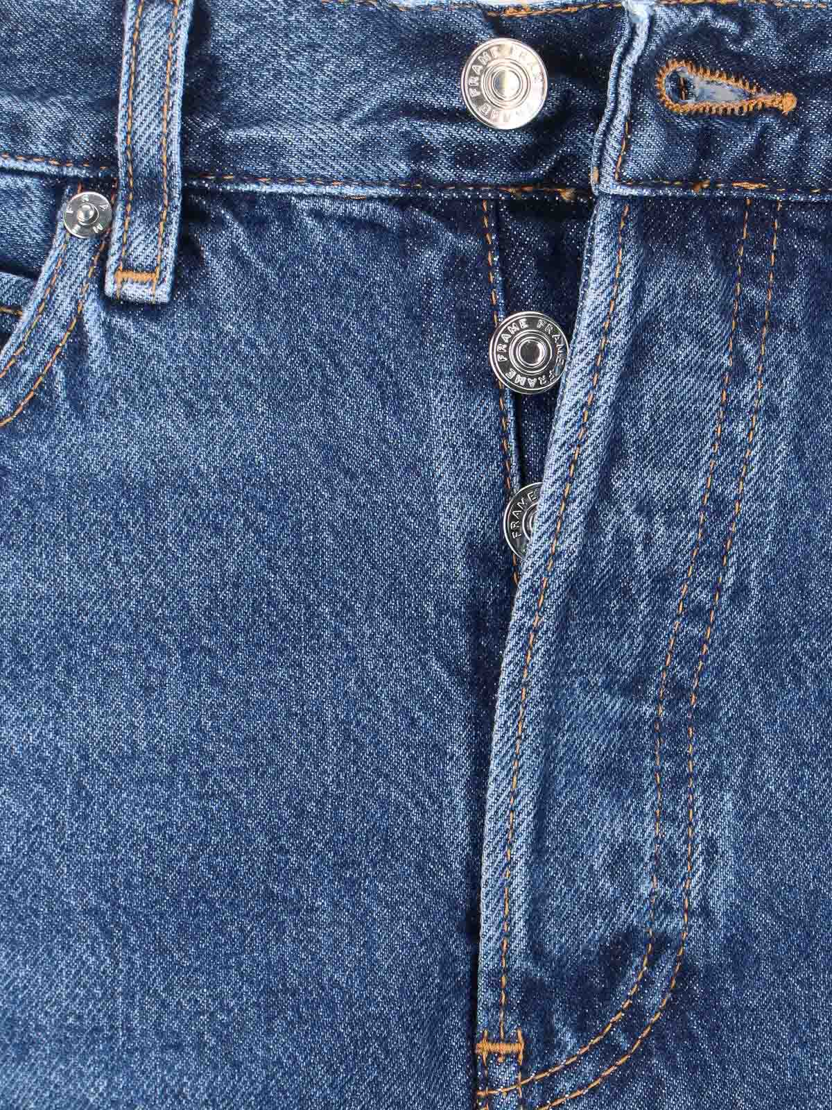 Flared frame jeans in blue cotton denim, high waist, button closure, five pocket design, flared leg.