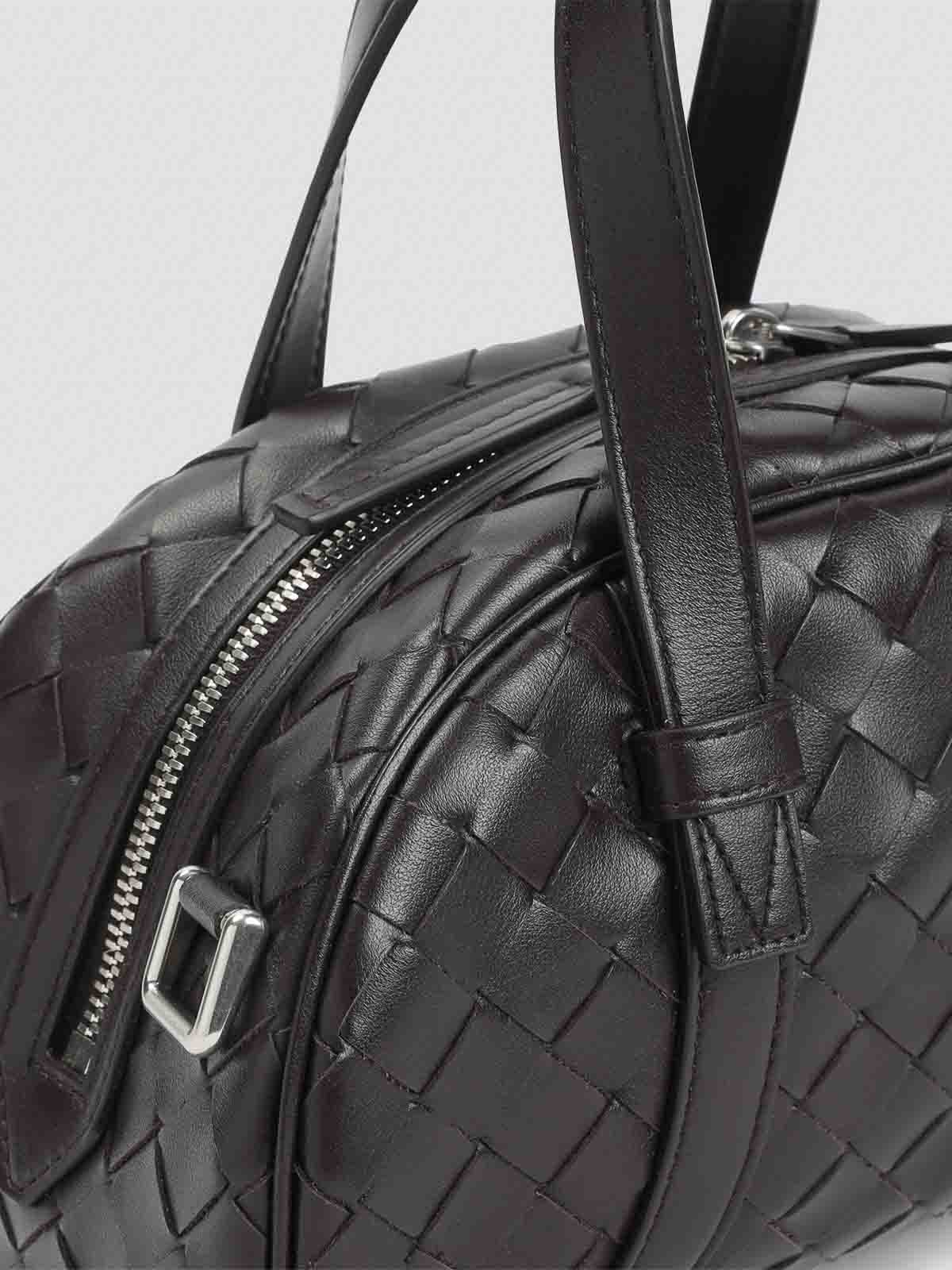 Bottega veneta jim queen small black leather shoulder bag. crafted from black intrecciato leather, silver-toned hardware, top handles, two-way zip fastening, attachable and adjustable shoulder strap.