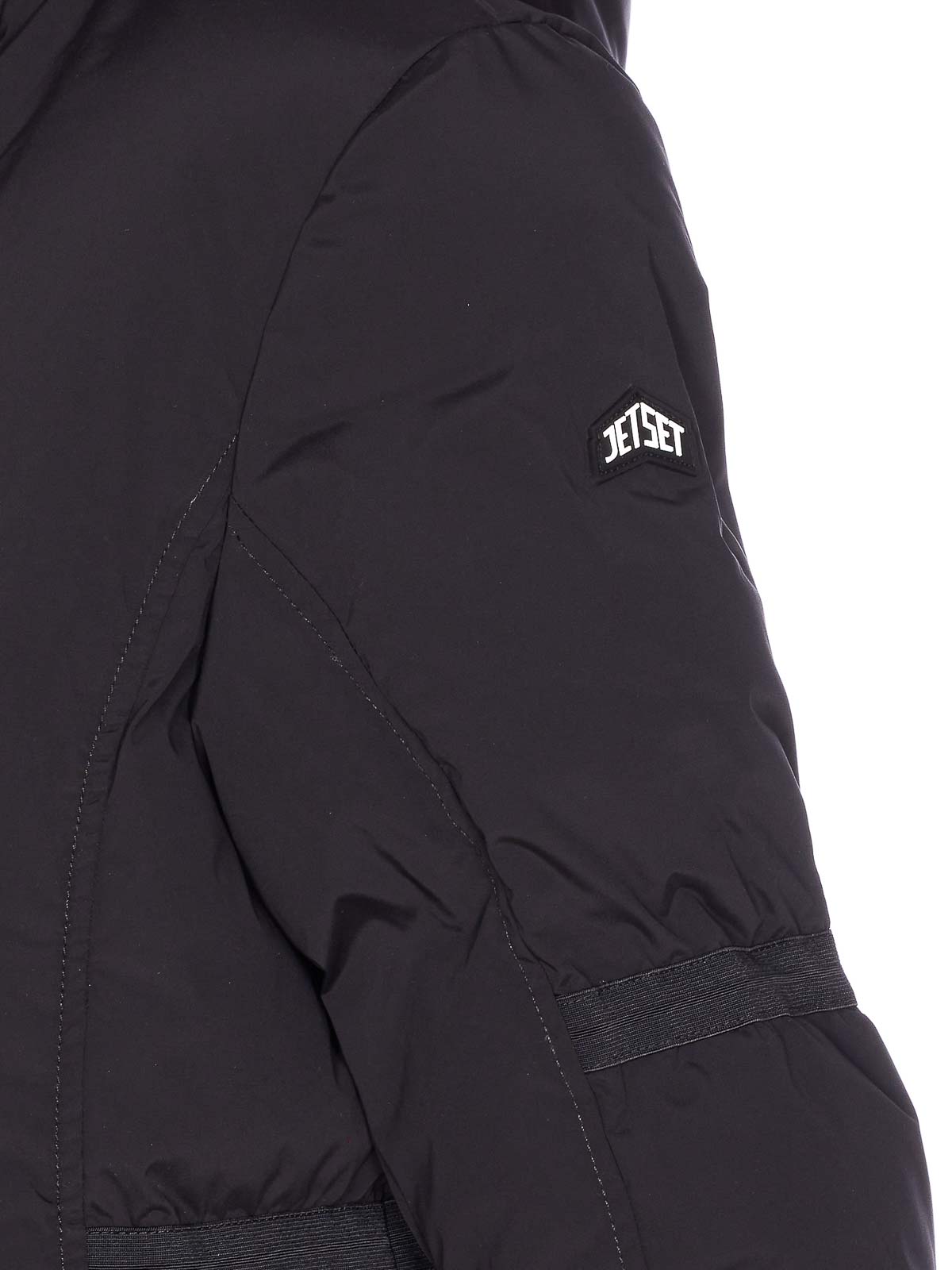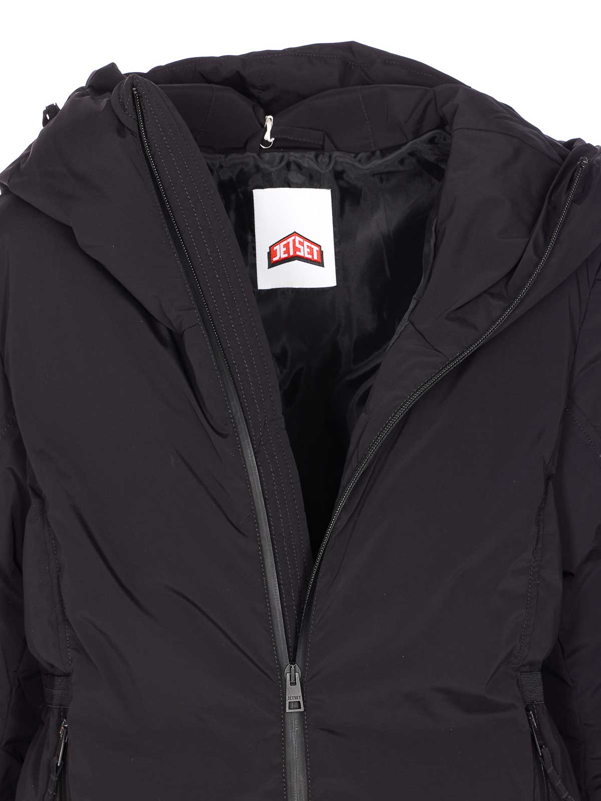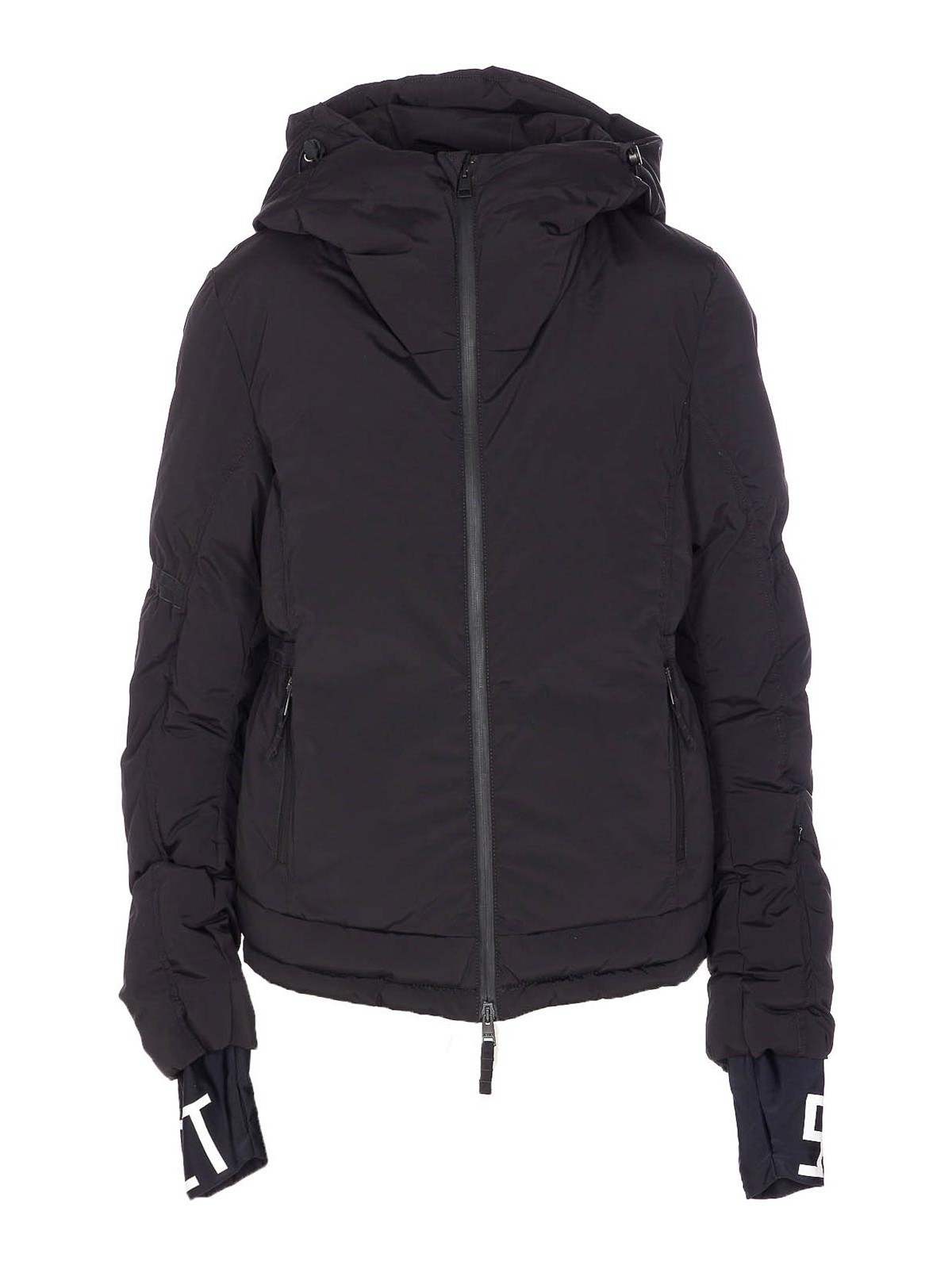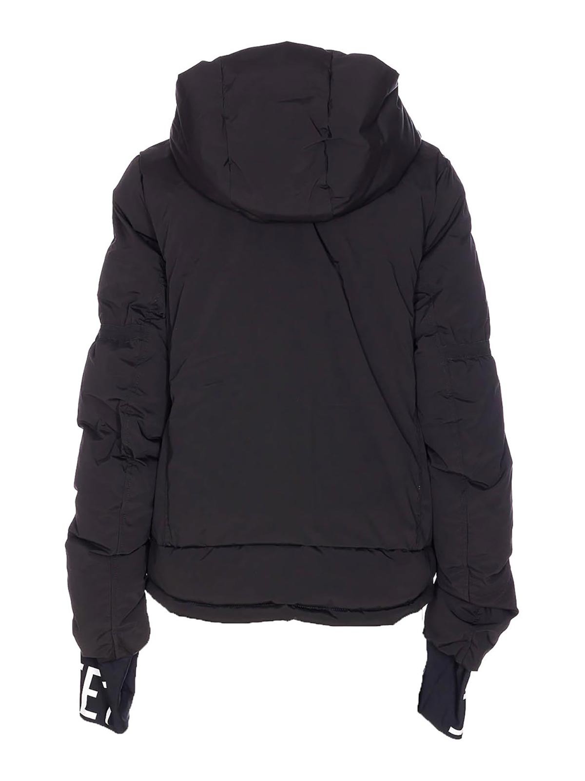 Jet set black joanna ski jacket with frontal zip closure hood detail, lateral patch logo, zip pockets, padded, cuffs with print logo