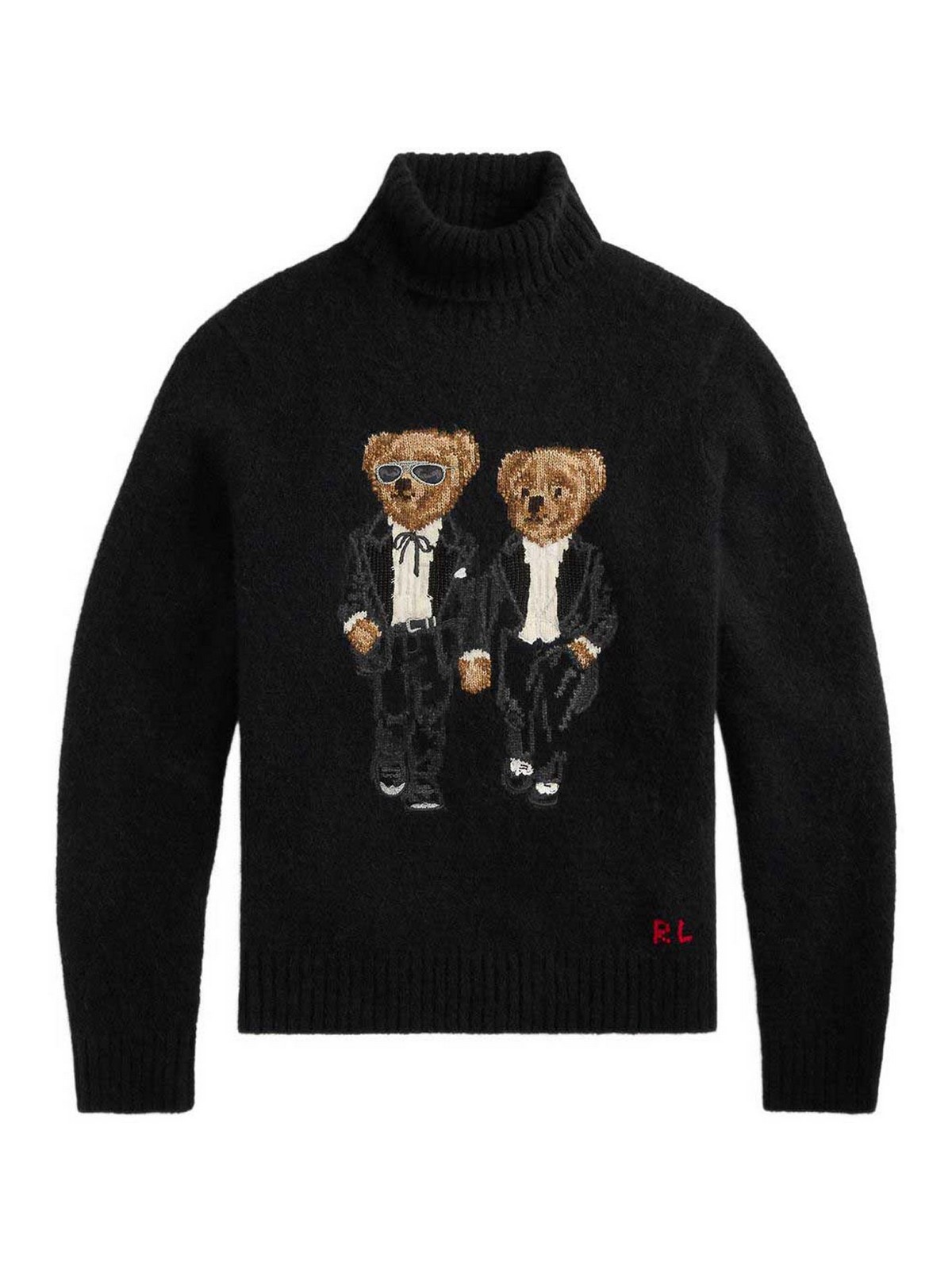 Black turtleneck embroidered bear motif long sleeves ribbed trims blend