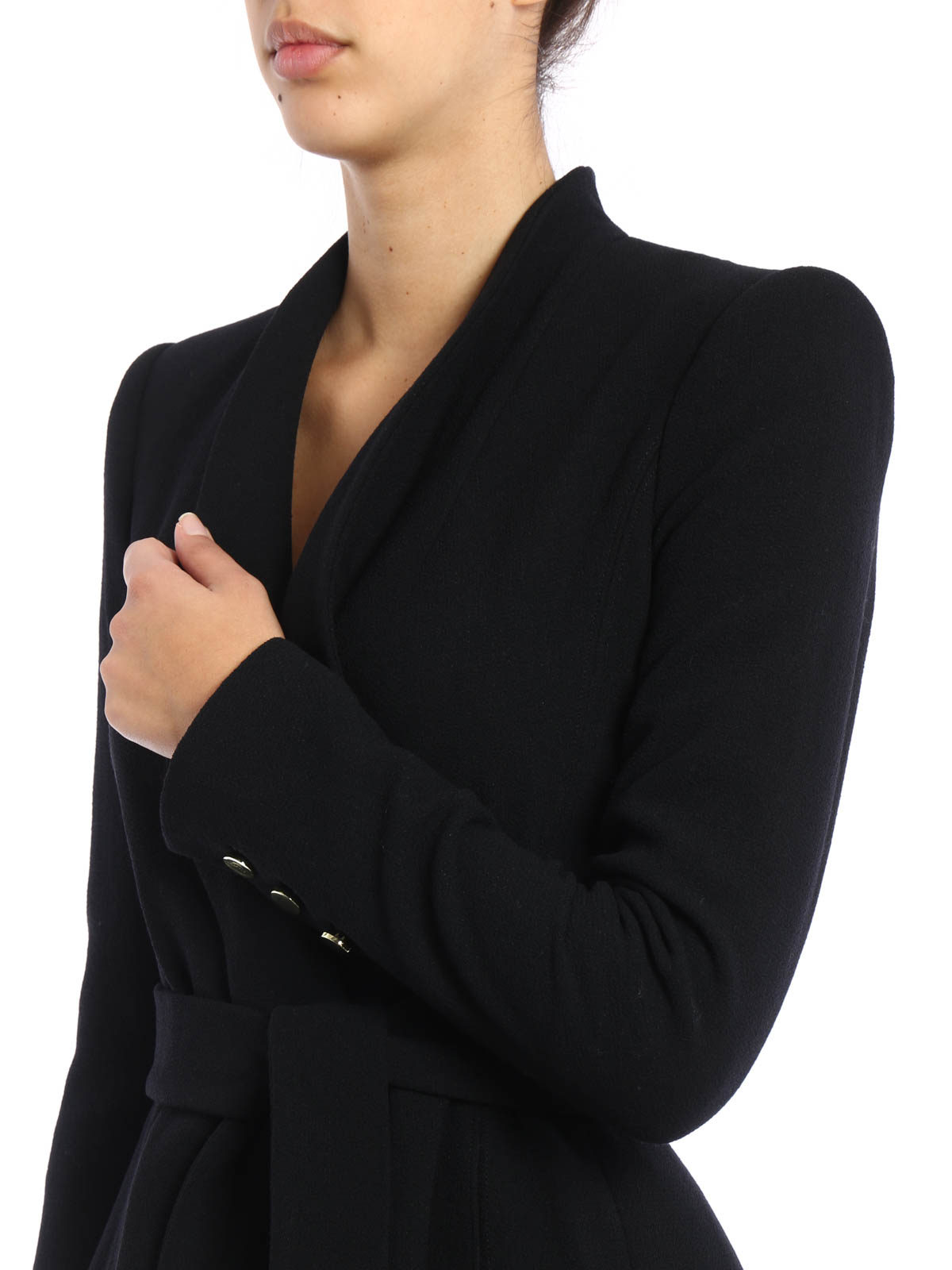 A sleek wool and silk crepe unique wrap coat featuring a long and flared back, shawl collar, shaped front, tie belt, seam pockets and gold-tone buttoned sleeves.