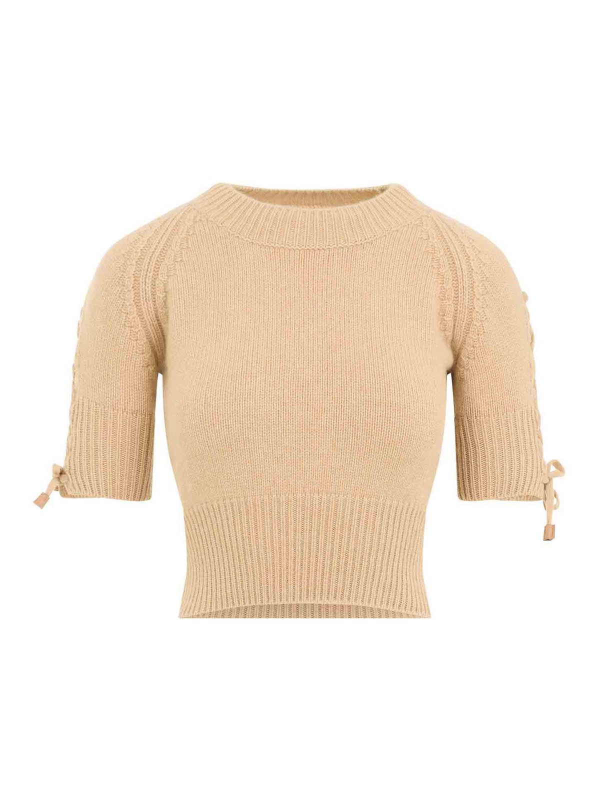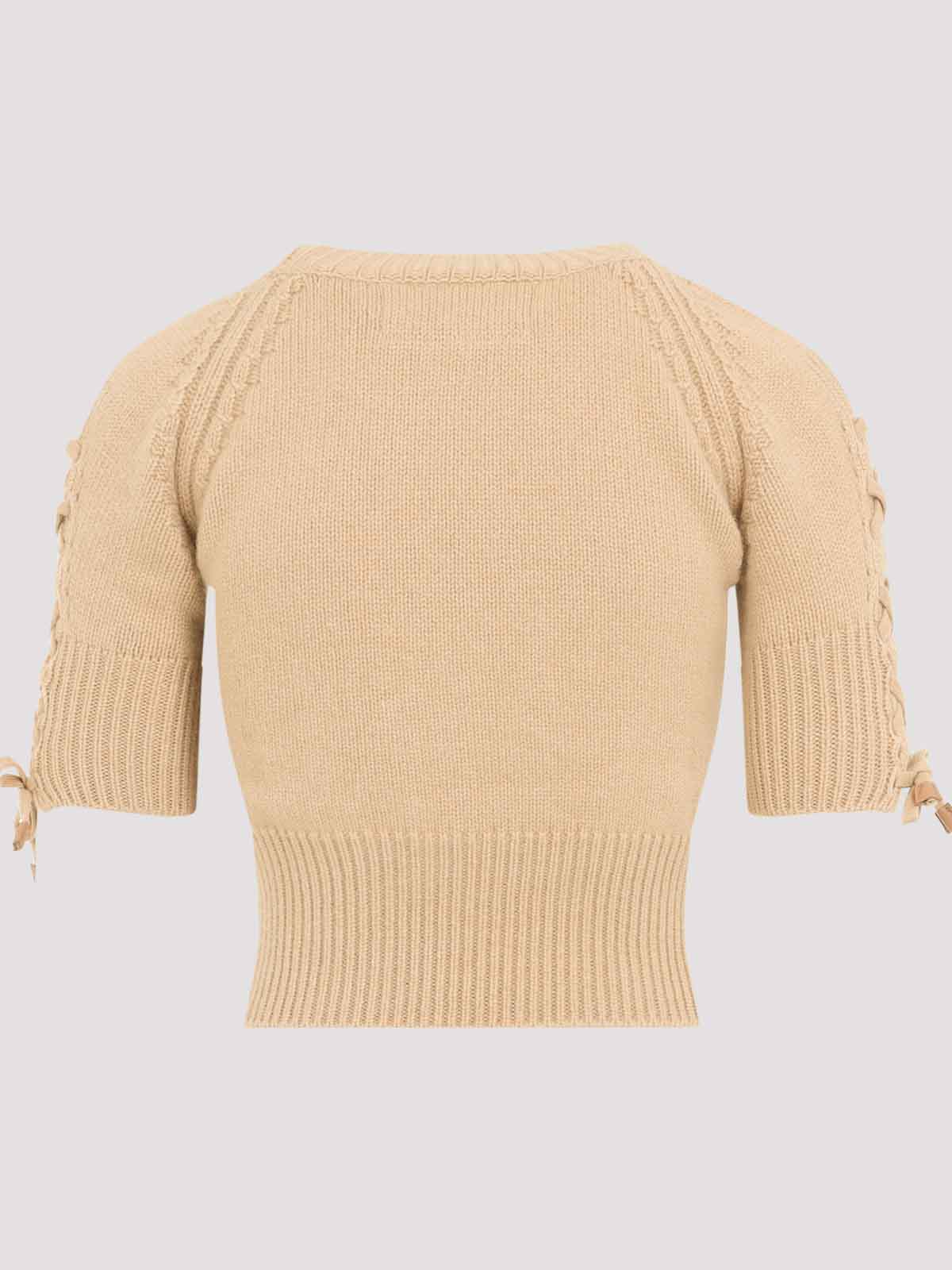 Ermanno scervino knit beige cashmere pullover. crafted from beige ribbed cashmere, round neckline, short sleeves with tonal lace-up details, ribbed edges, cropped length.