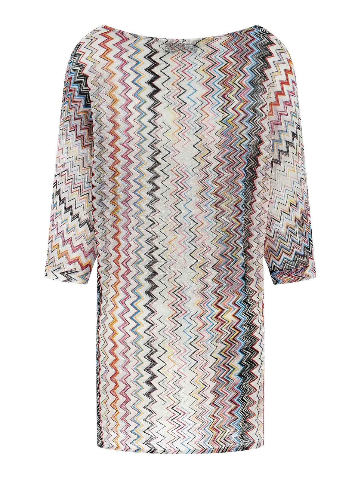 Knitted top, zigzag pattern, round neckline, loose fit with short bat sleeves and tight on the hips.