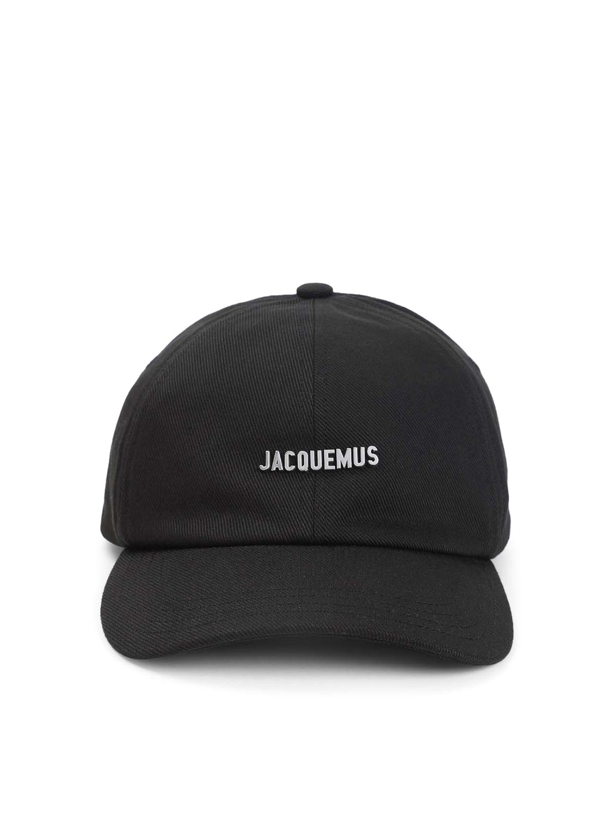 Jacquemus la gadjo black cotton hat. crafted from black cotton canvas, silver-toned metal logo on the front, tonal embroidered eyelets, adjustable back strap with square buckle.