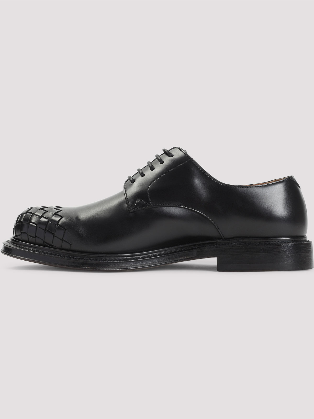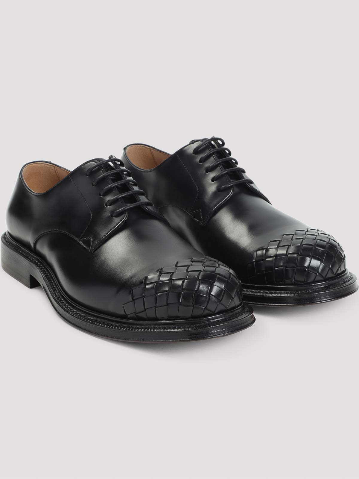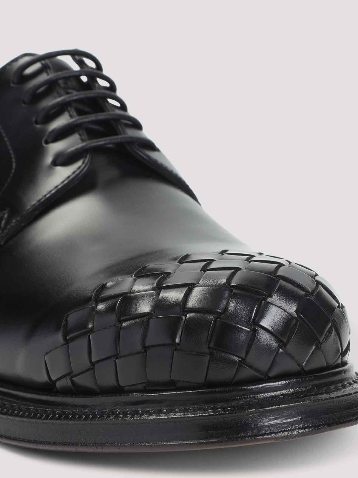 Bottega veneta black leather lace up shoes. pure black leather shoes, round toe with signature intreccio detail, top tonal lace-up fastening, tonal stitching, tonal sole.
