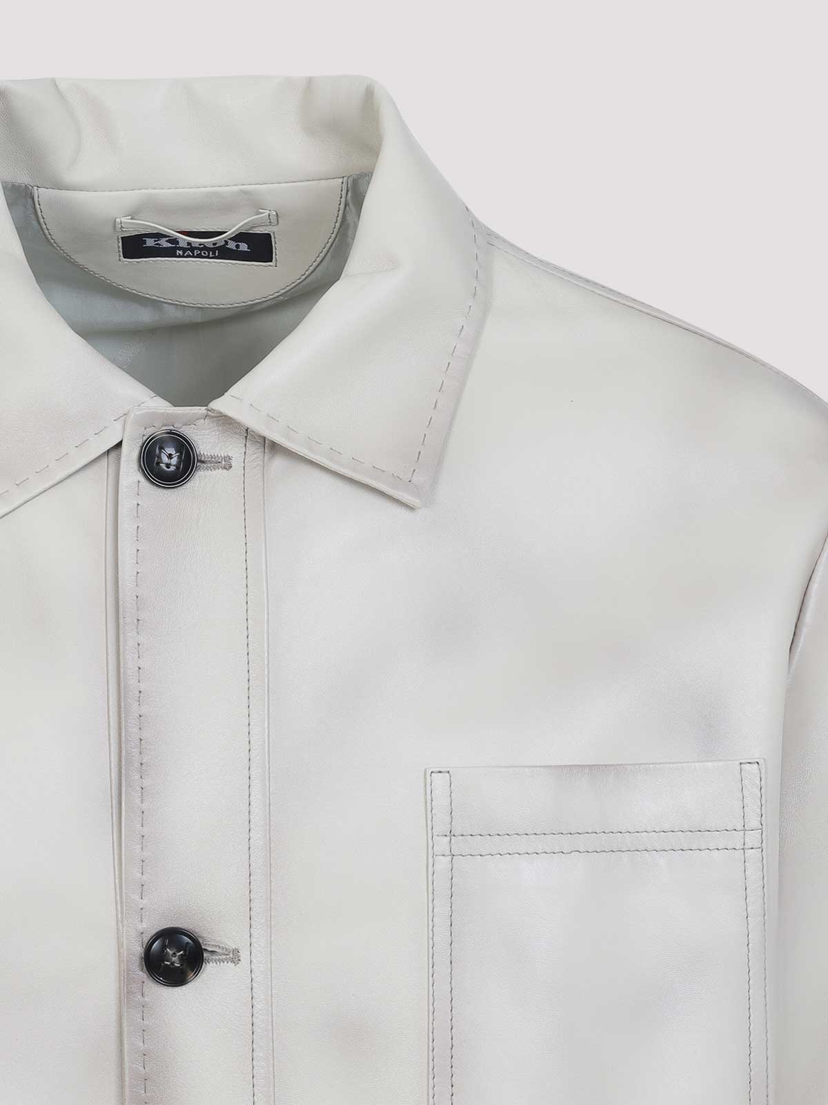 Kiton beige lamb leather jacket. crafted from beige soft lamb leather with an all-over dirty effect, featuring a pointed collar, a front button fastening, a patch pocket on the chest, long sleeves with buttoned cuffs, a straight hem, and a full lining.