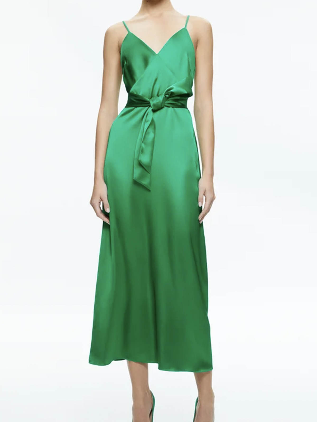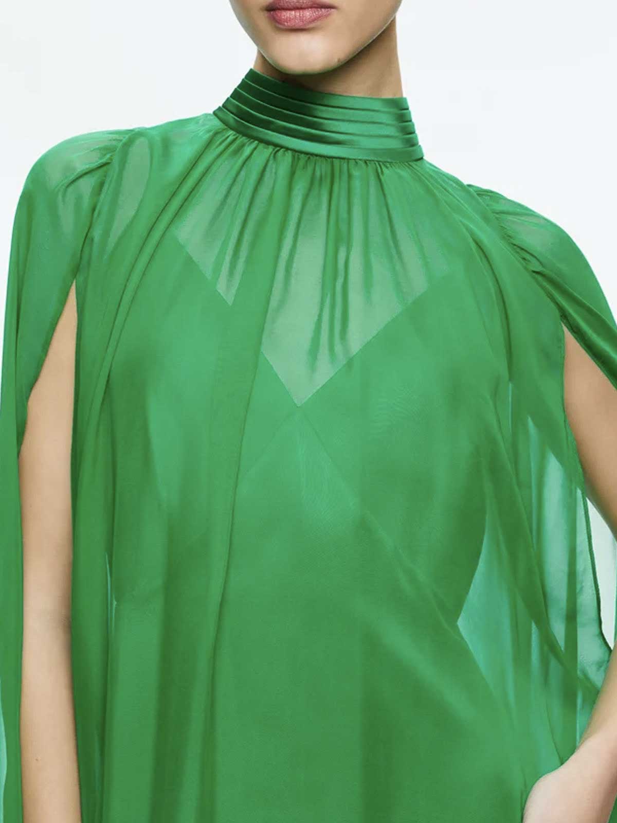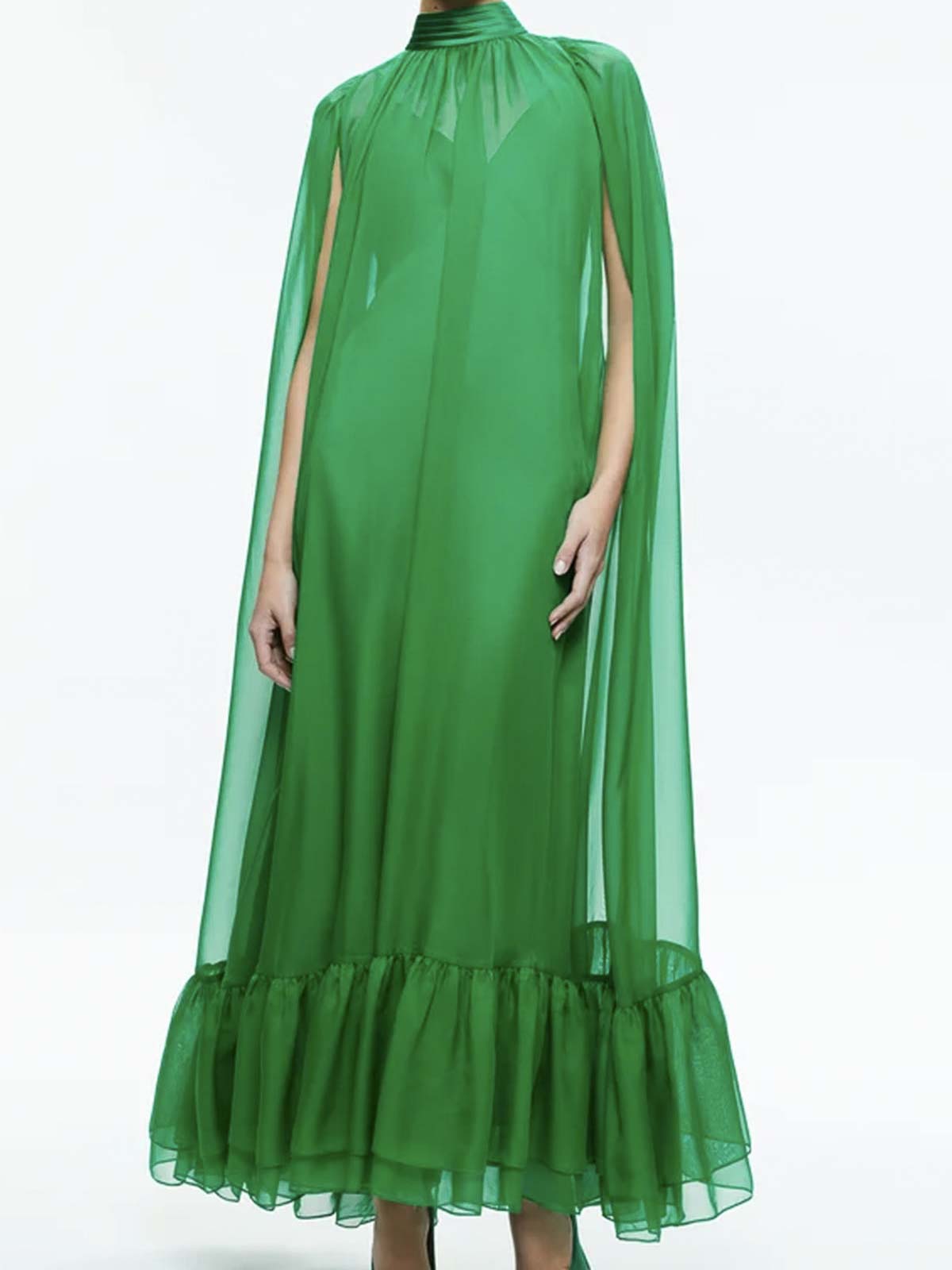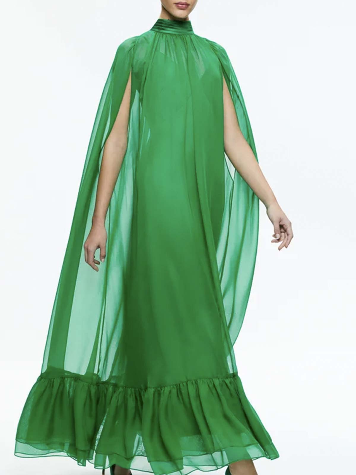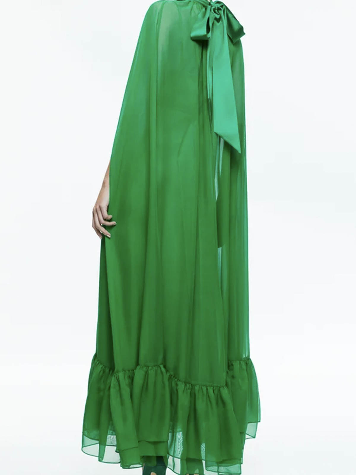 Emerald green model, cape design, two separate pieces, v-neck, thin straps, back zip and hidden hook closure, removable belt. cape with high collar, back bow closure, slits on the arms, final ruffle, medium length design.