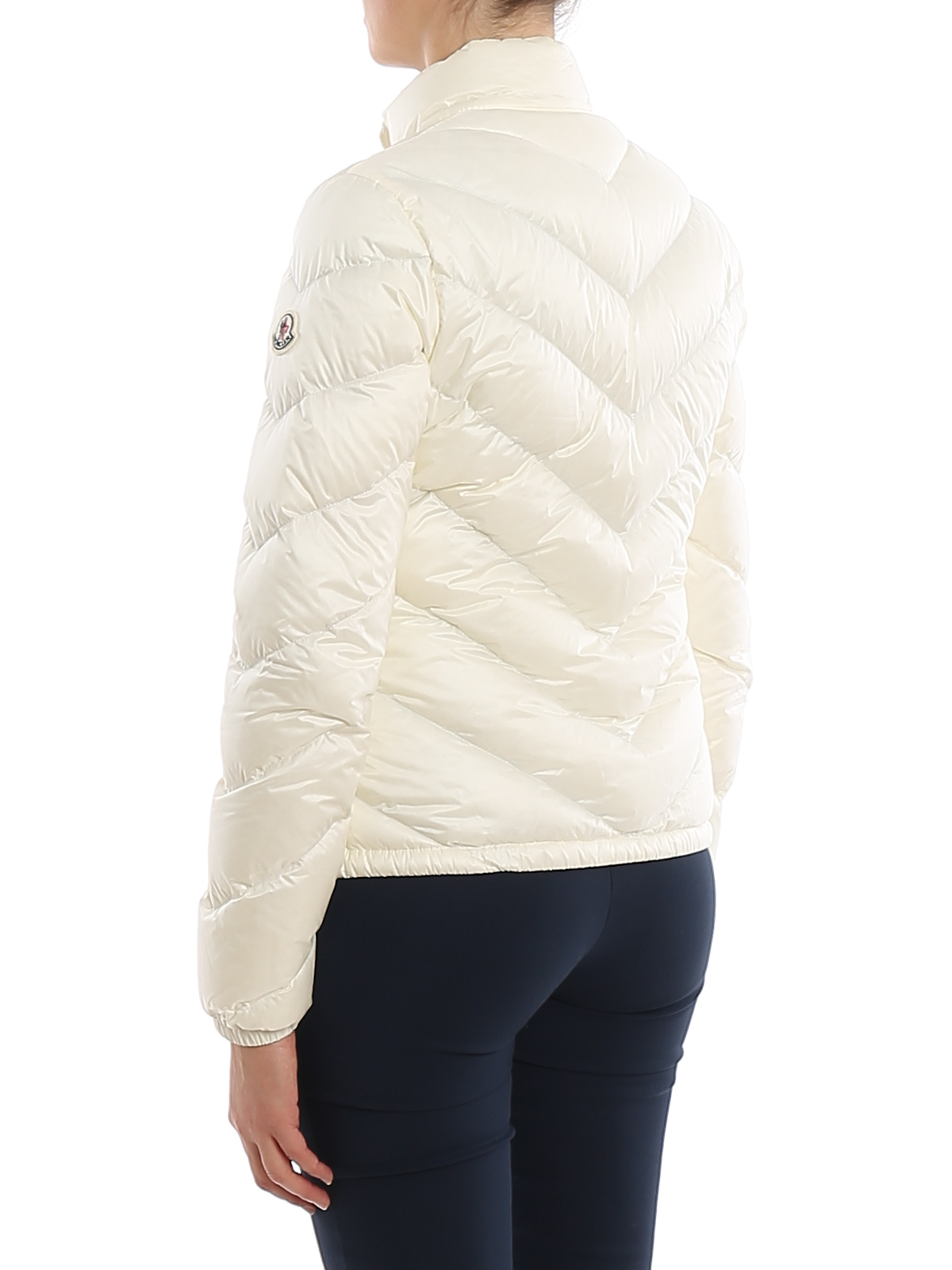 Nylon padded jacket detailed with V stitchings, snap flap pockets, logo patch at sleeves, zip fastening and snap collar.