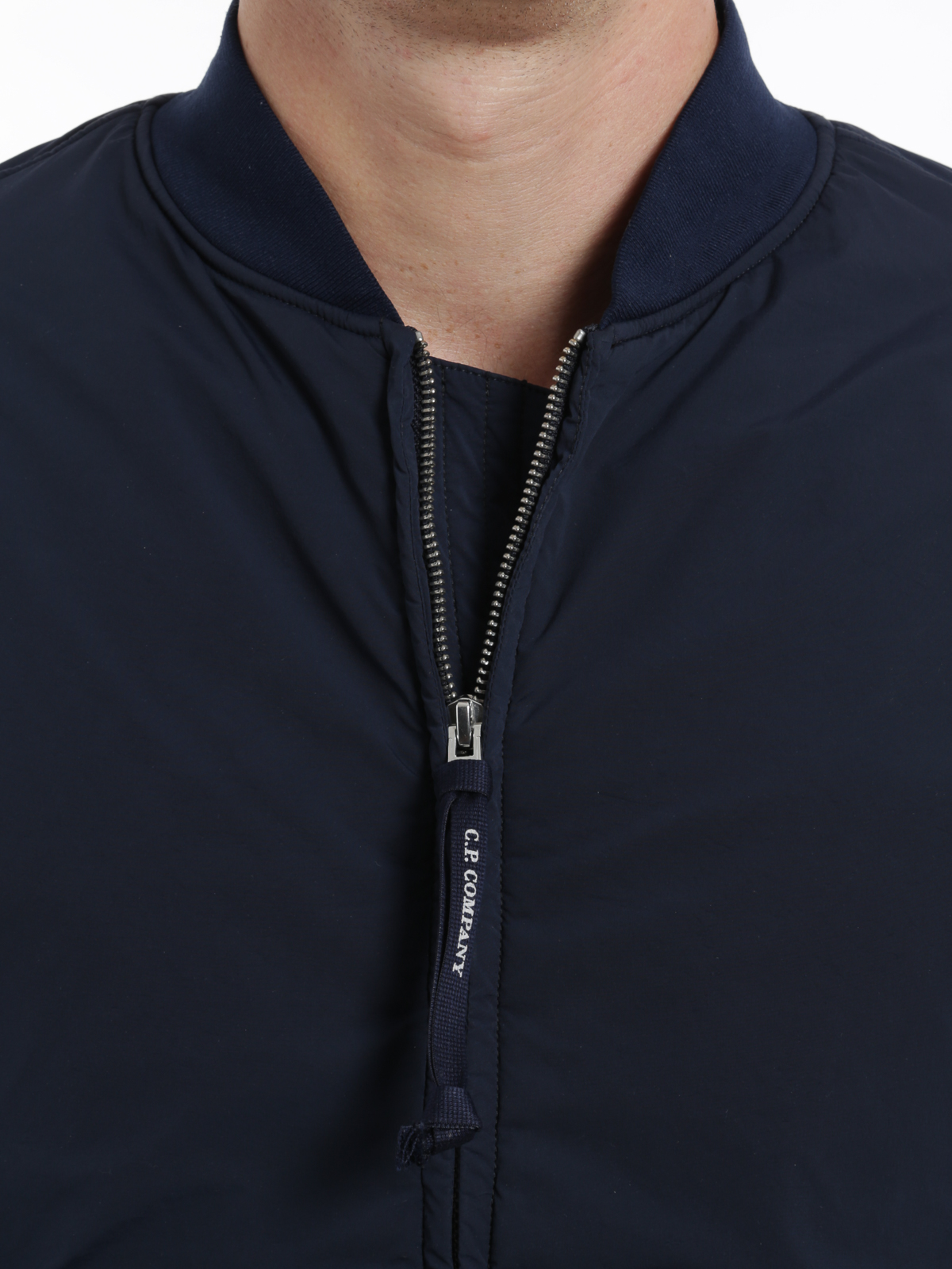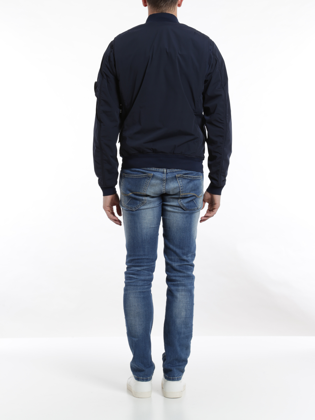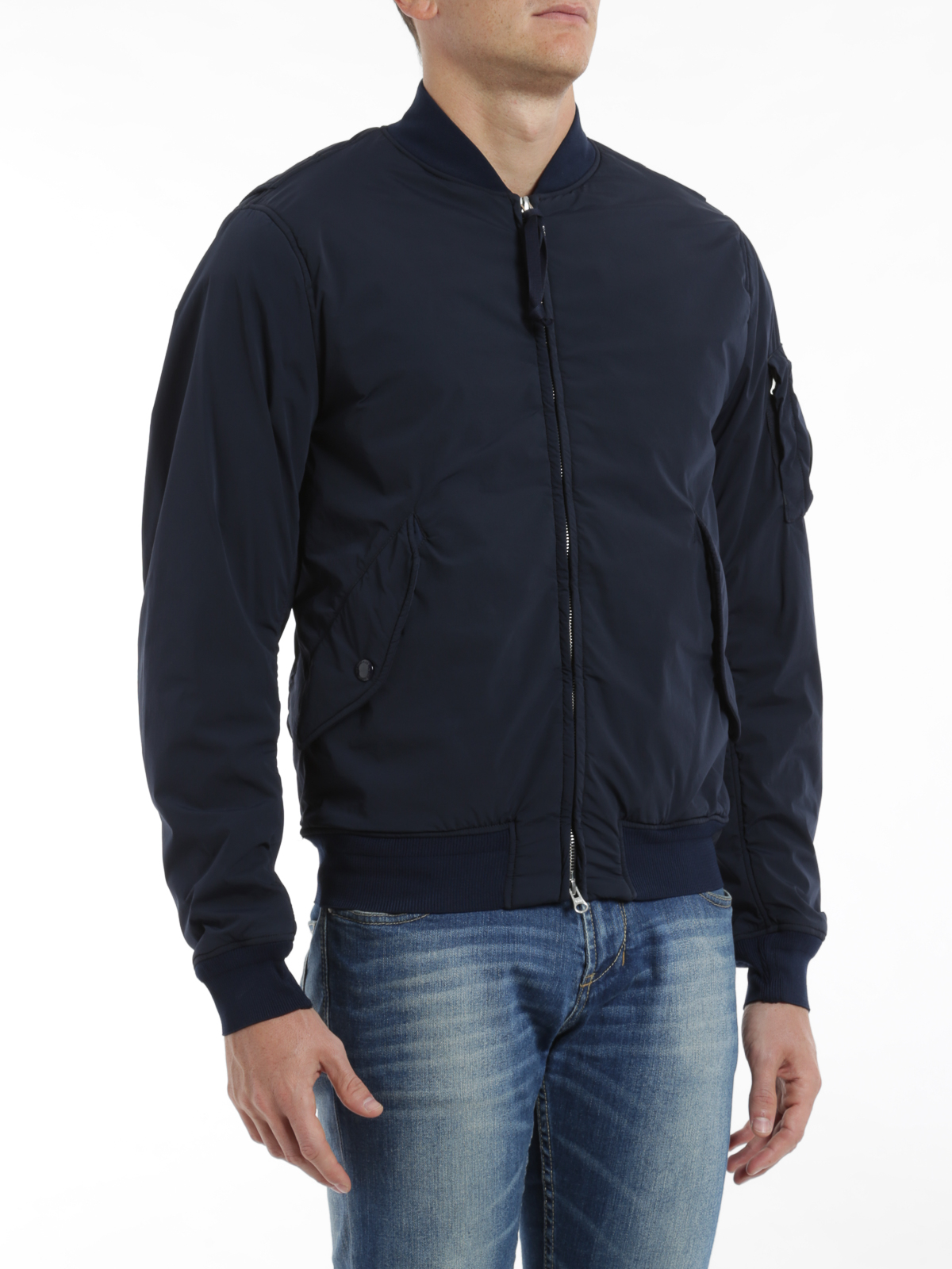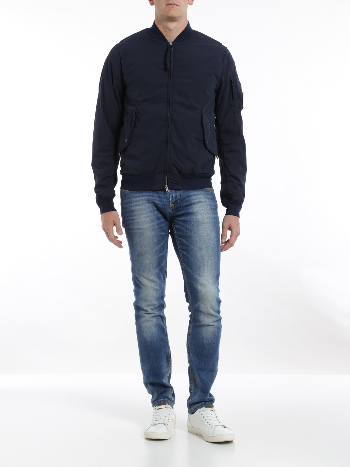 Jacket featuring elastic ribbed collar, cuffs and hem, double slide zipper fastening with fabric branded detail on zip puller, two frontal slanted flap pockets with snap button closure, a zipped pocket on sleeve with contrasting branded detail, two internal buttoned pockets and two internal branded tags. Lined.
