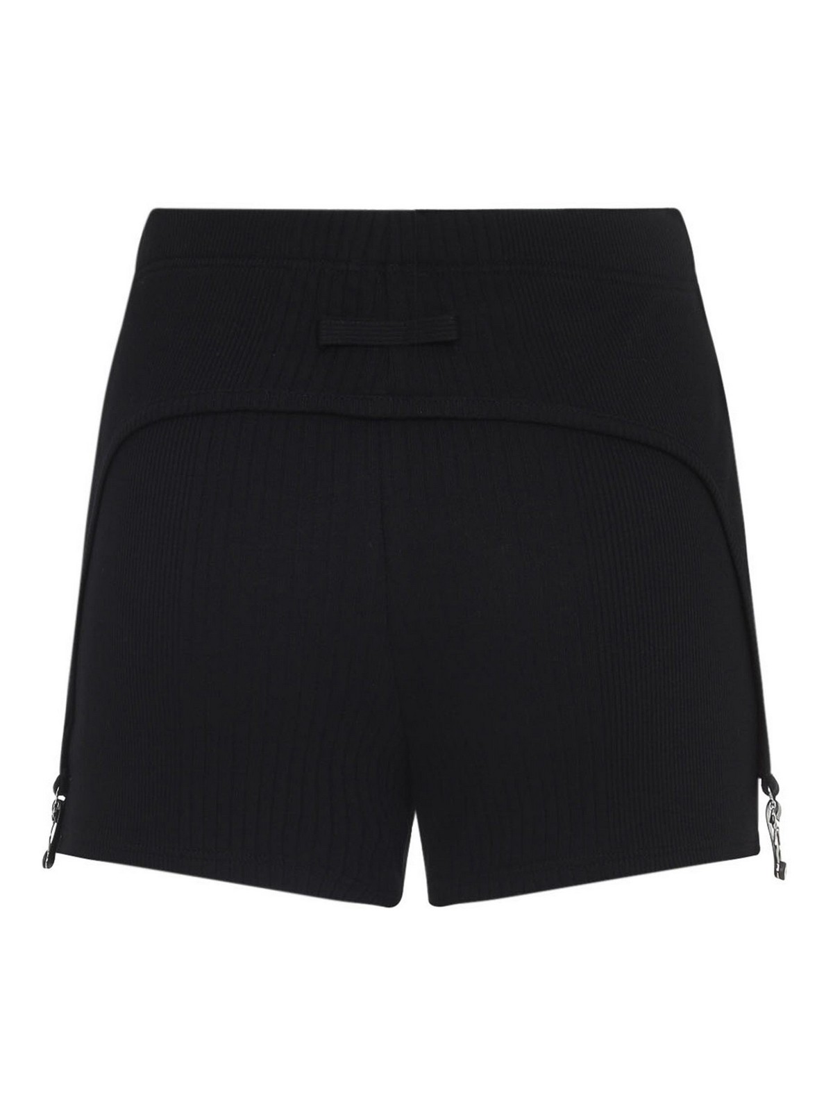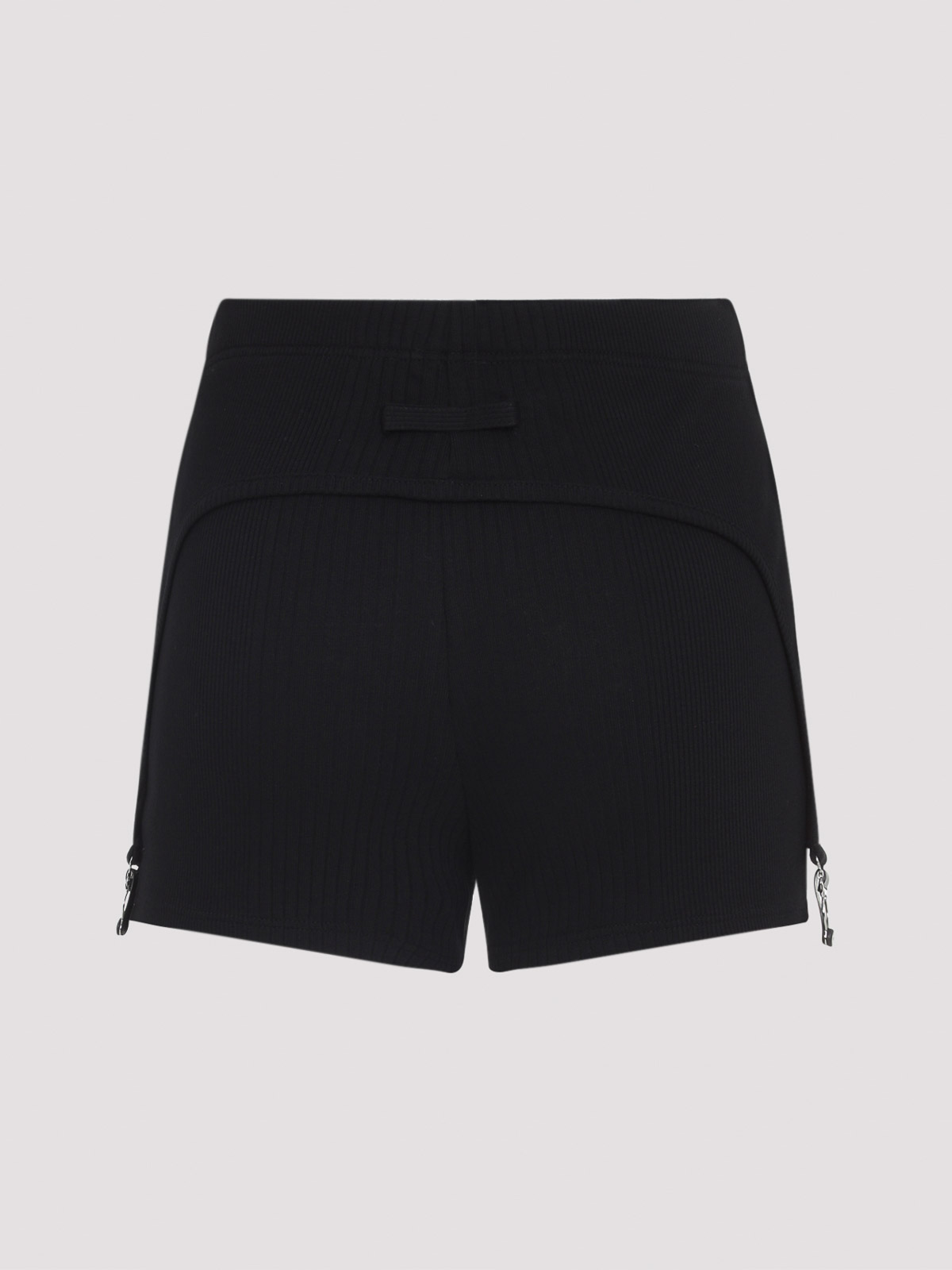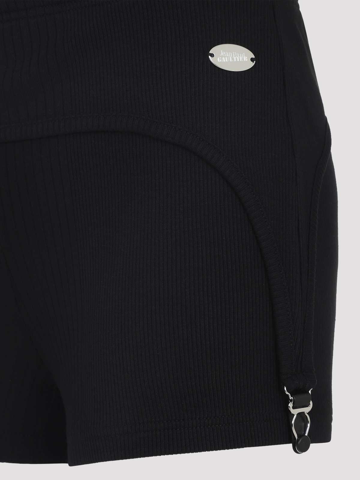 Jean paul gaultier lingerie garter black shorts crafted from black ribbed turn, waistband with lingerie garters, toned branded plaque on the side horizontal belt loop at the back slim fit