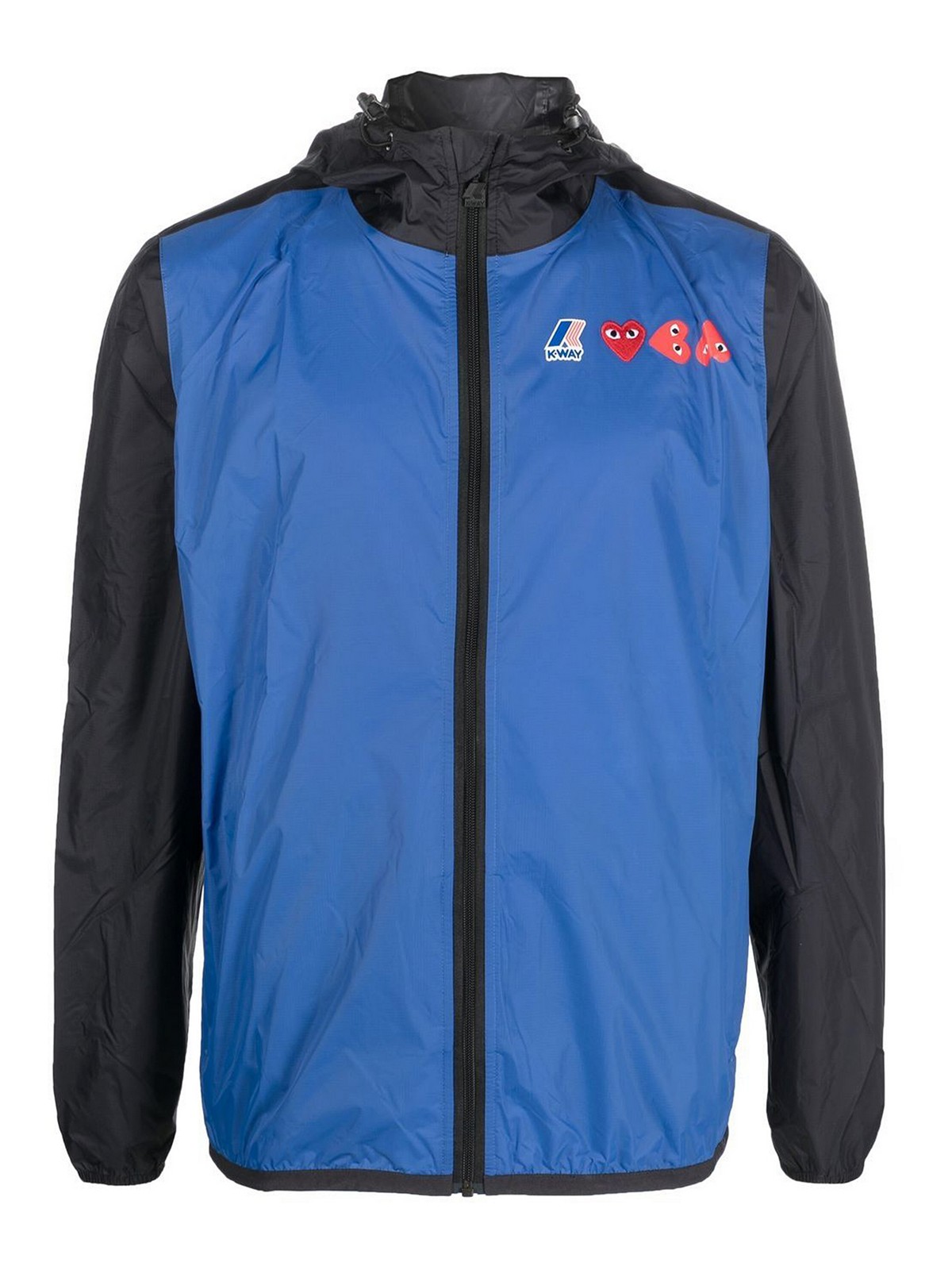 Logo-print long-sleeved jacket from comme des garons featuring black, royal blue, lightweight, logo print to the front, classic hood, high neck, front zip fastening, long sleeves, elasticated cuffs and elasticated hem.