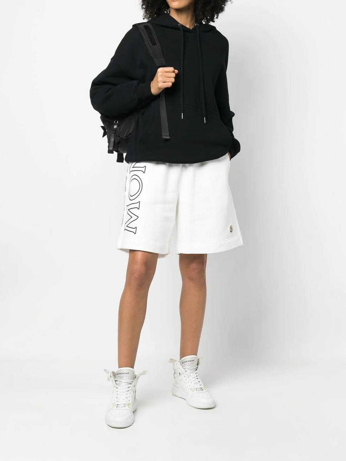 Logo-print toggle shorts from moncler featuring optical white logo print at the leg elasticated toggle detailing two side slit pockets and knee-length