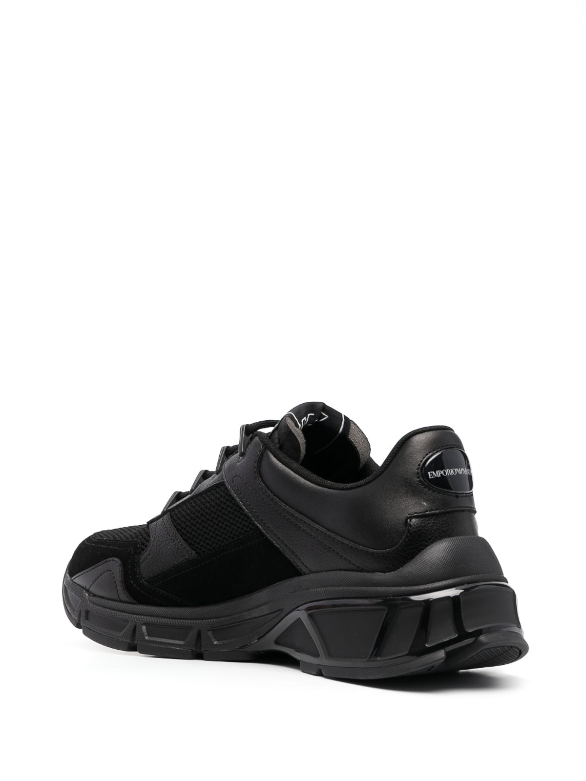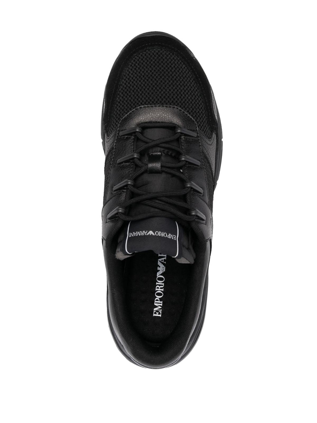 Leather low-top sneakers by emporio armani with tone-on-tone logo plaque in black calfskin logo patch on the tongue mesh panels round toe lace-up closure on the front logo and chunky