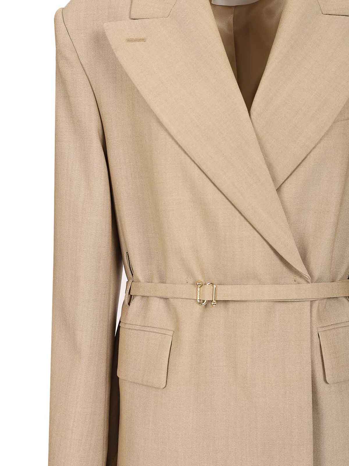 Long double, breasted blazer by sportmax with deep slits along the sides and detached back double, wrap belt cinching the waist with s, buckle arrow lapel neckline double, breasted with hidden snap buttons
