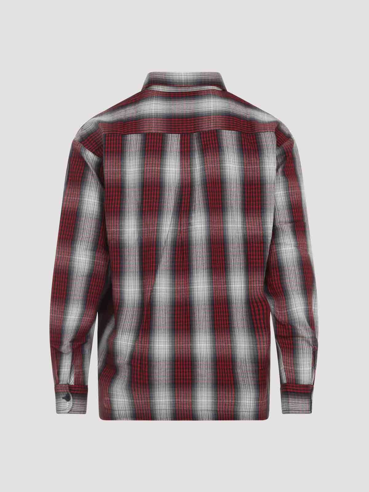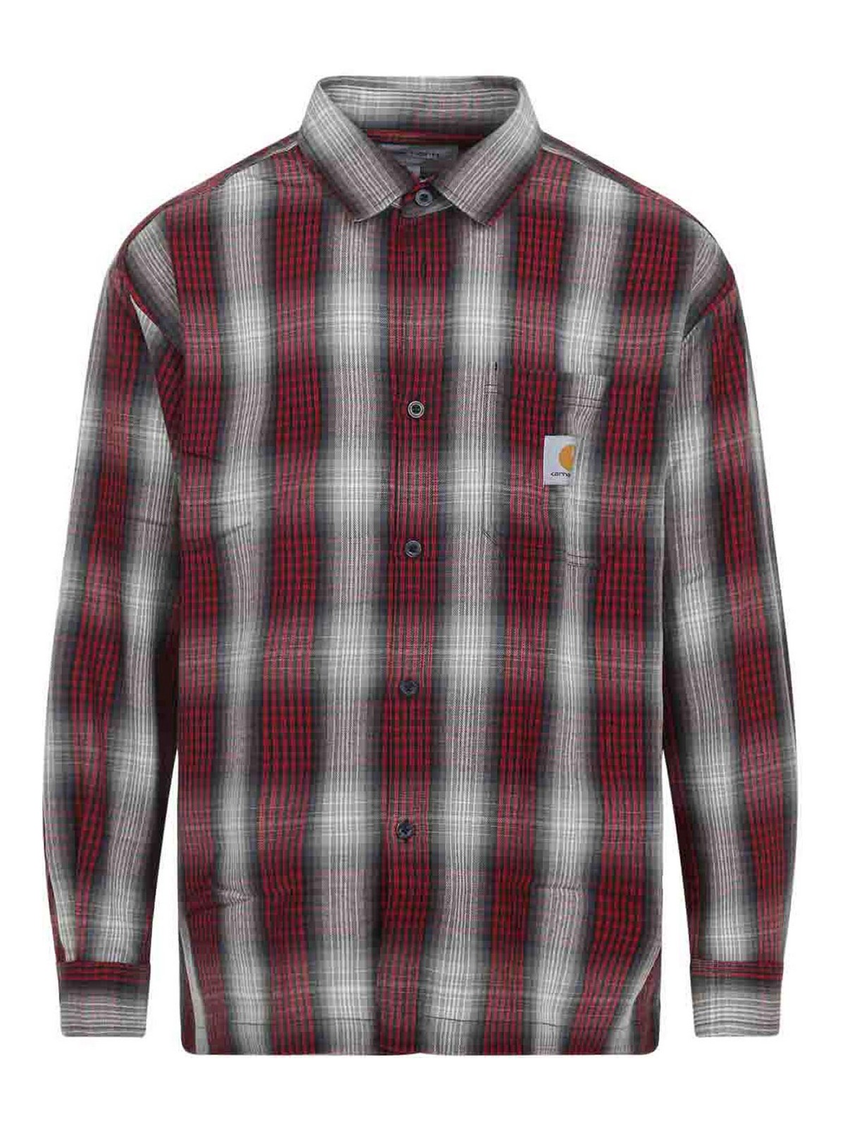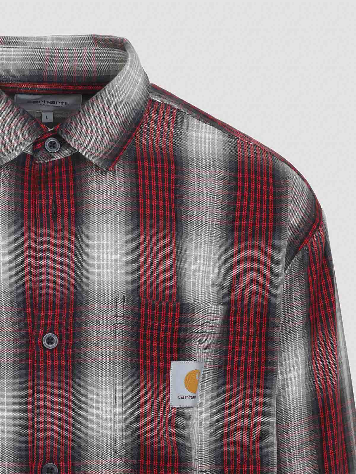 Carhartt wip l/s harlin multicolor acrylic shirt. crafted from checkered red and grey acrylic, pointed collar, front button fastening, patch pocket and logo label detail at the chest, dropped shoulders, long sleeves with buttoned cuffs, back yoke and box pleat, loose fit.
