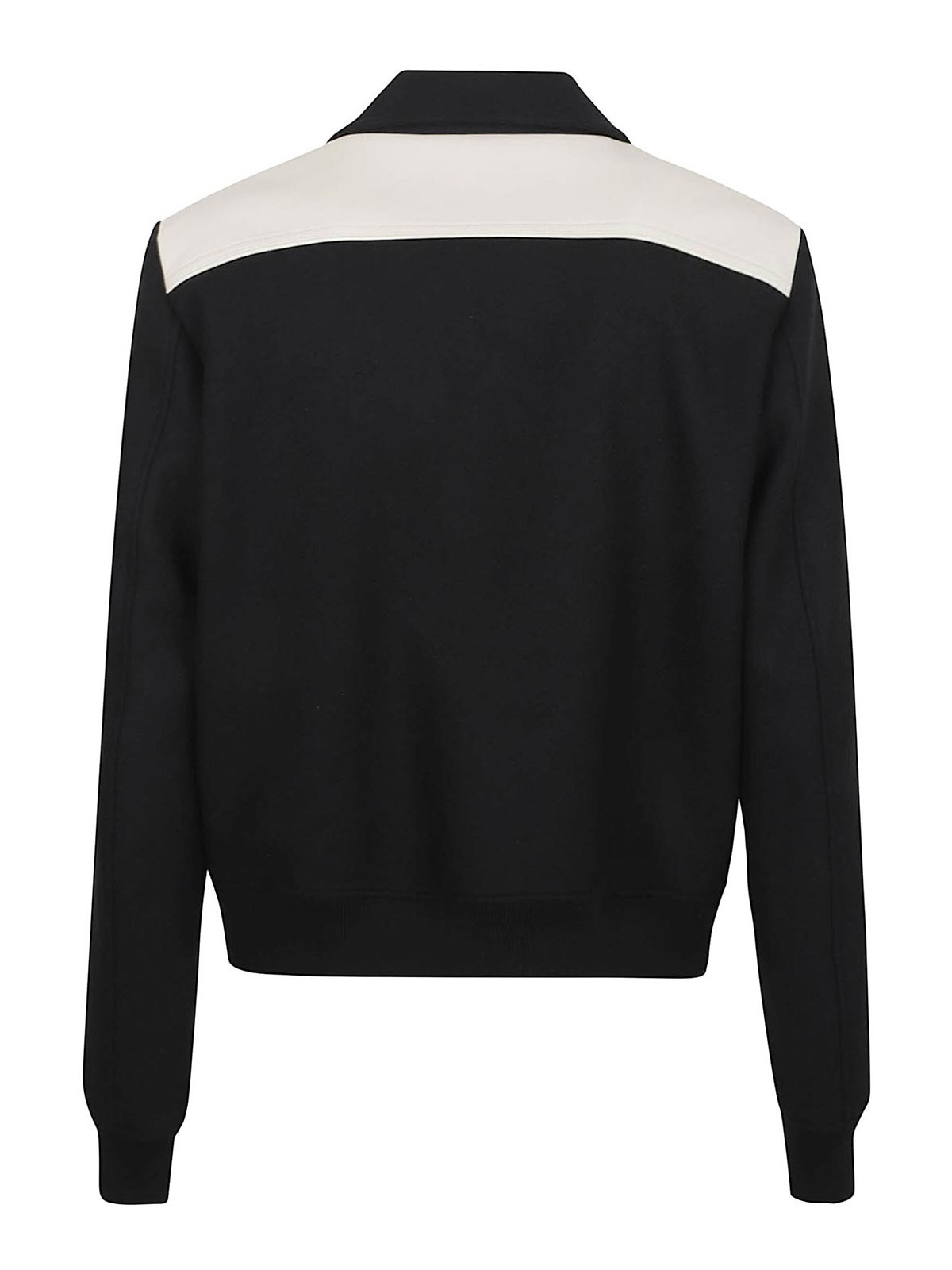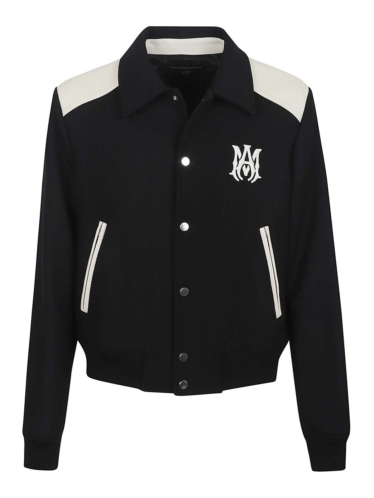Inspired by classic American college style, this Amiri varsity jacket reinterprets a streetwear icon with a luxurious twist. Crafted from high-quality black wool, it features contrasting ivory details on the shoulders and pockets, as well as the embroidered Amiri Hollywood logo on the chest, emphasizing the brand's identity. The metal snap closure and ribbed cuffs and hem ensure a comfortable, sporty fit. A versatile piece, perfect for completing trendy casual outfits or adding an urban-chic touch to more refined combinations. Color: Black with ivory details. Material: Wool (main body) with contrasting inserts. Details: Embroidered logo on the chest. Closure: Front snap buttons. Collar, cuffs, and hem: Elastic ribbed. Fit: Regular fit.