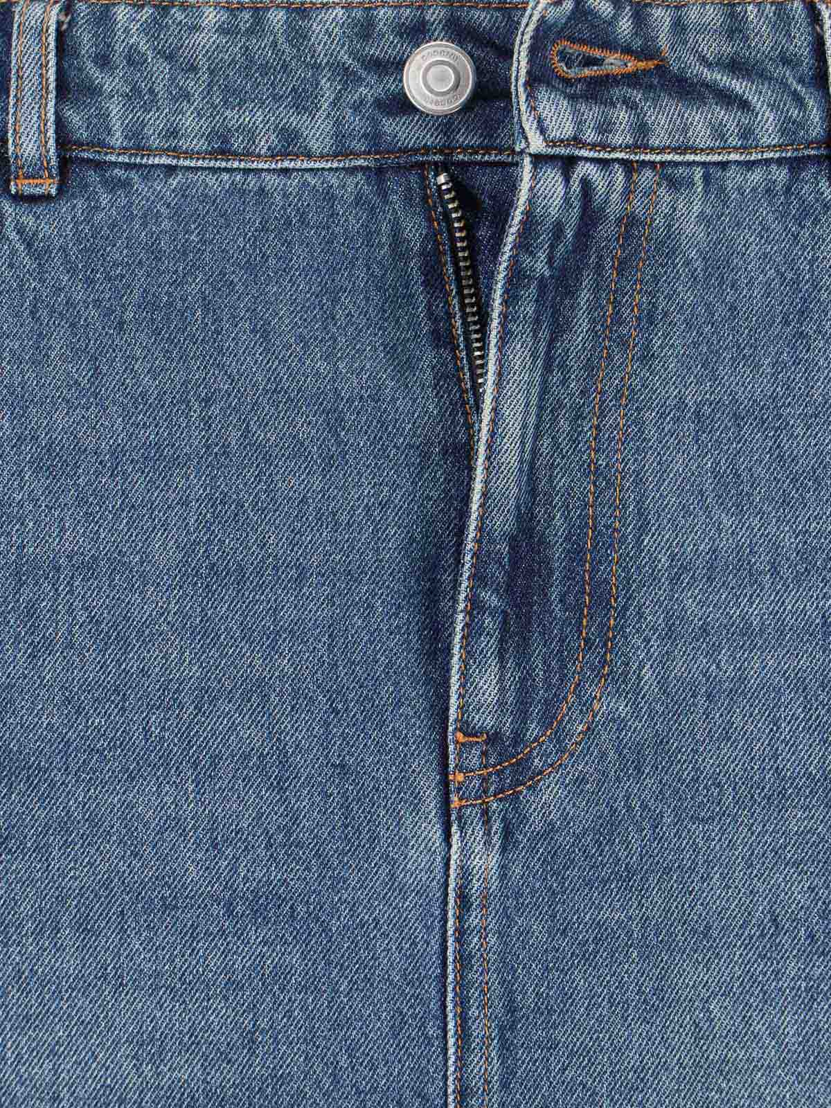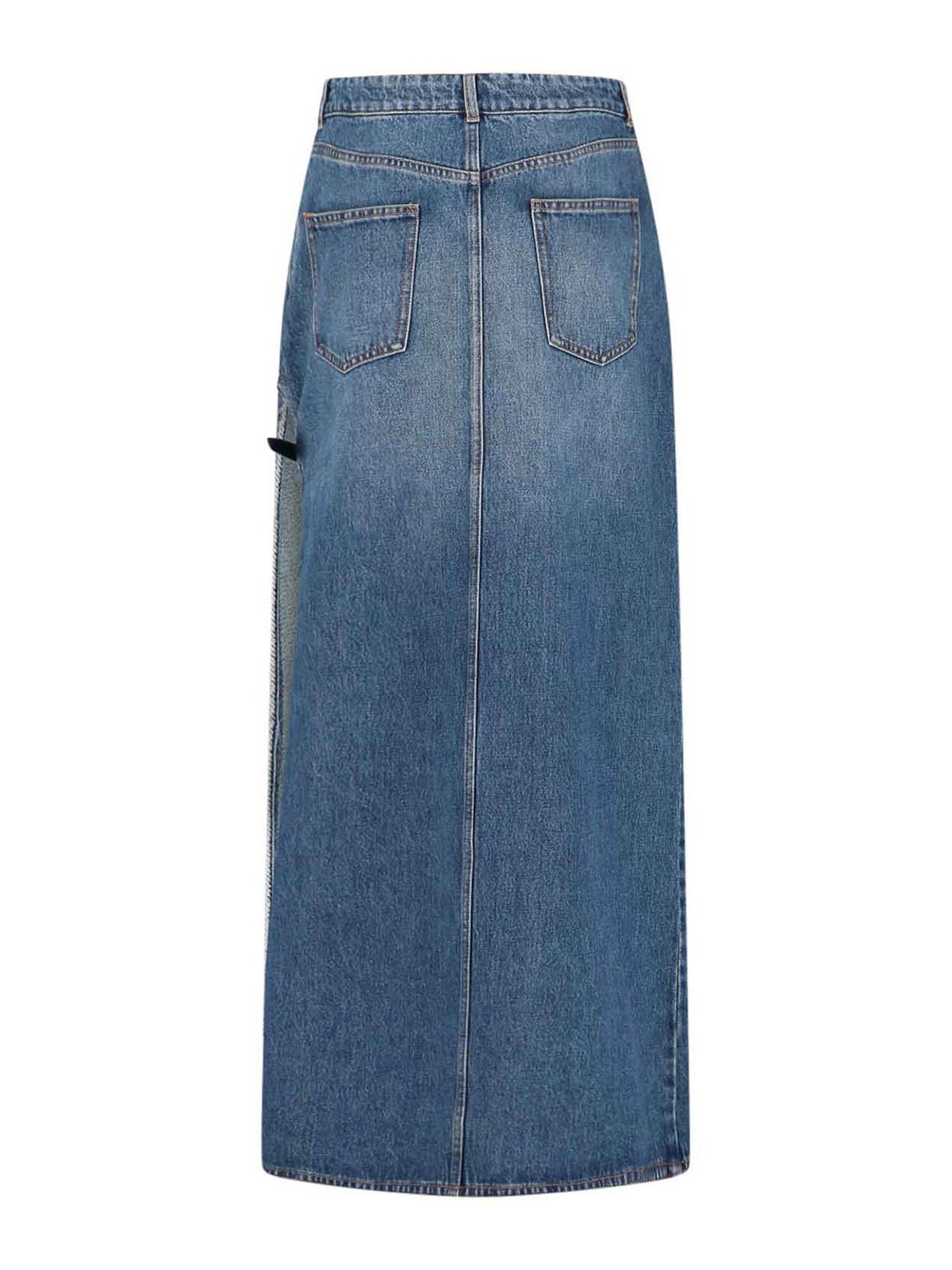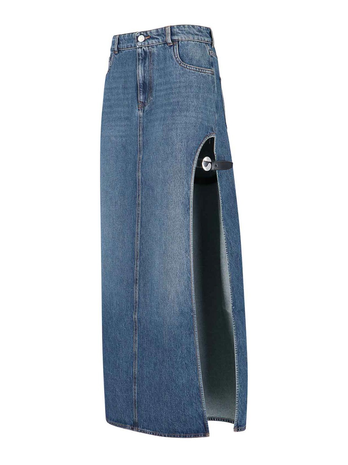 Coperni garden maxi skirt, in light blue denim, medium waist, belt loops, button and zip closure, five pocket design, maxi side slit, side garter strap detail, straight hem.