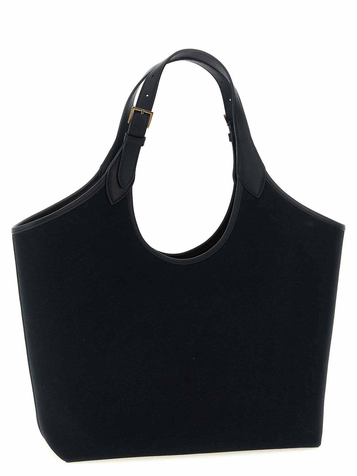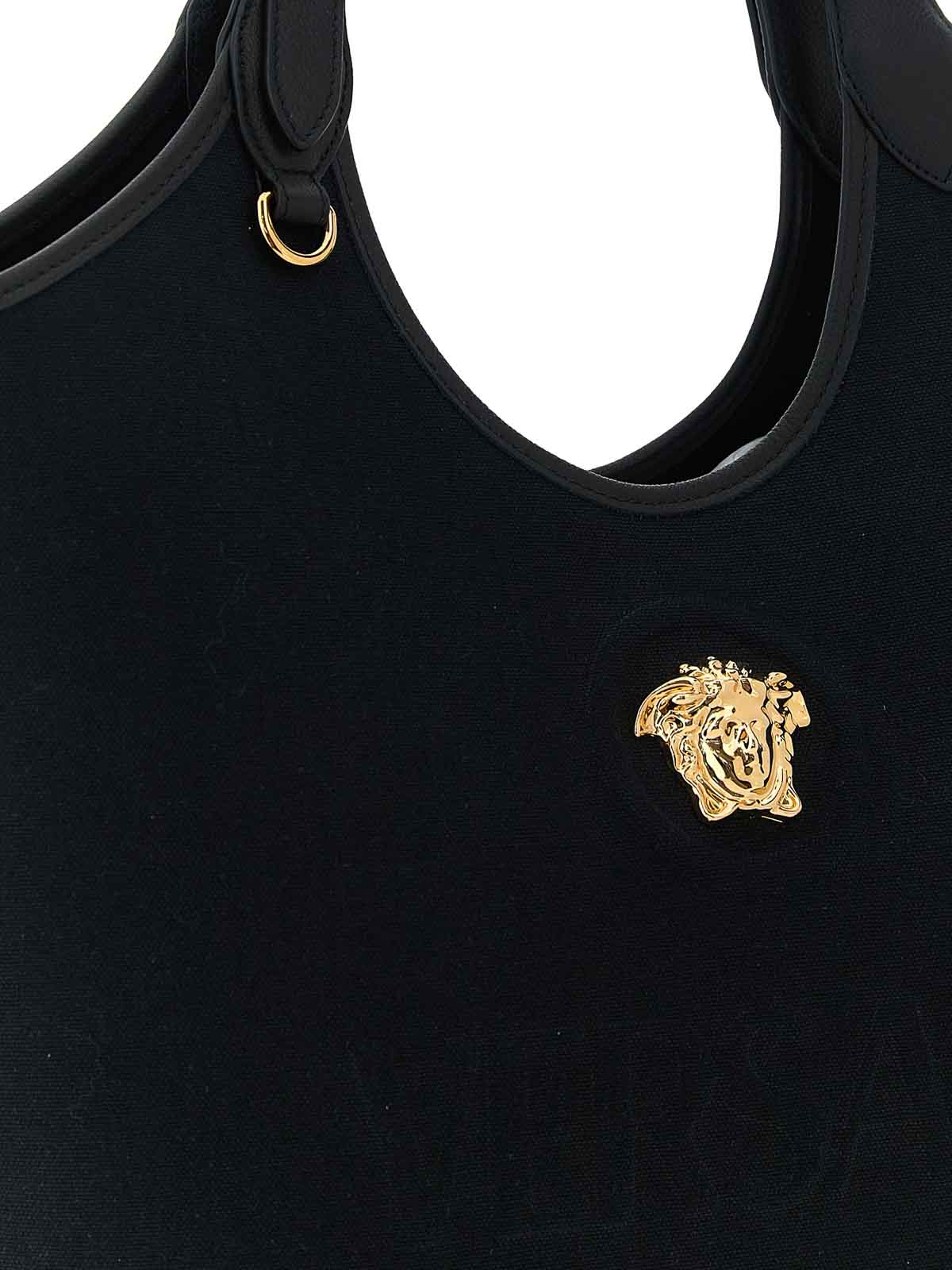 Medium 'la medusa' canvas shopping bag with contrast leather details, metal 'la medusa' detail and front 3d logo, double adjustable handle, internal snap button closure, rigid base with metal feet, adjustable and removable shoulder strap.