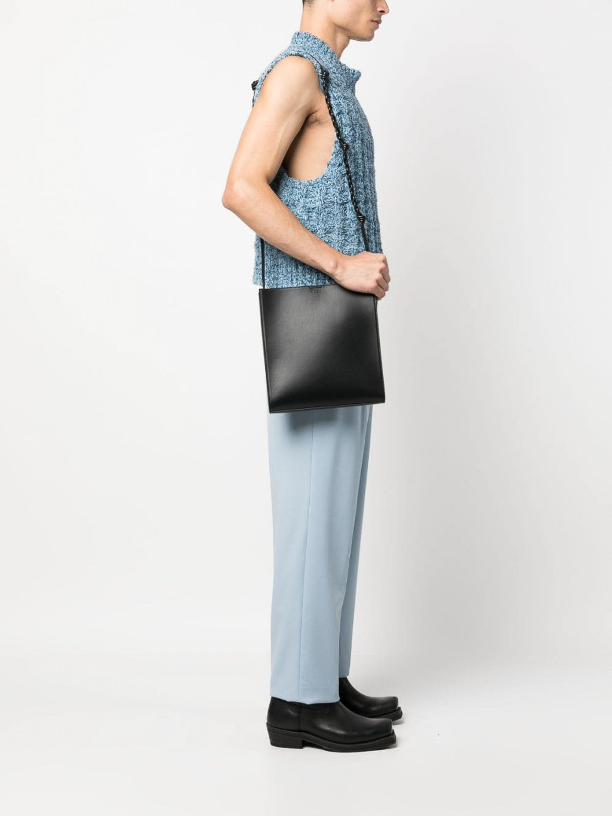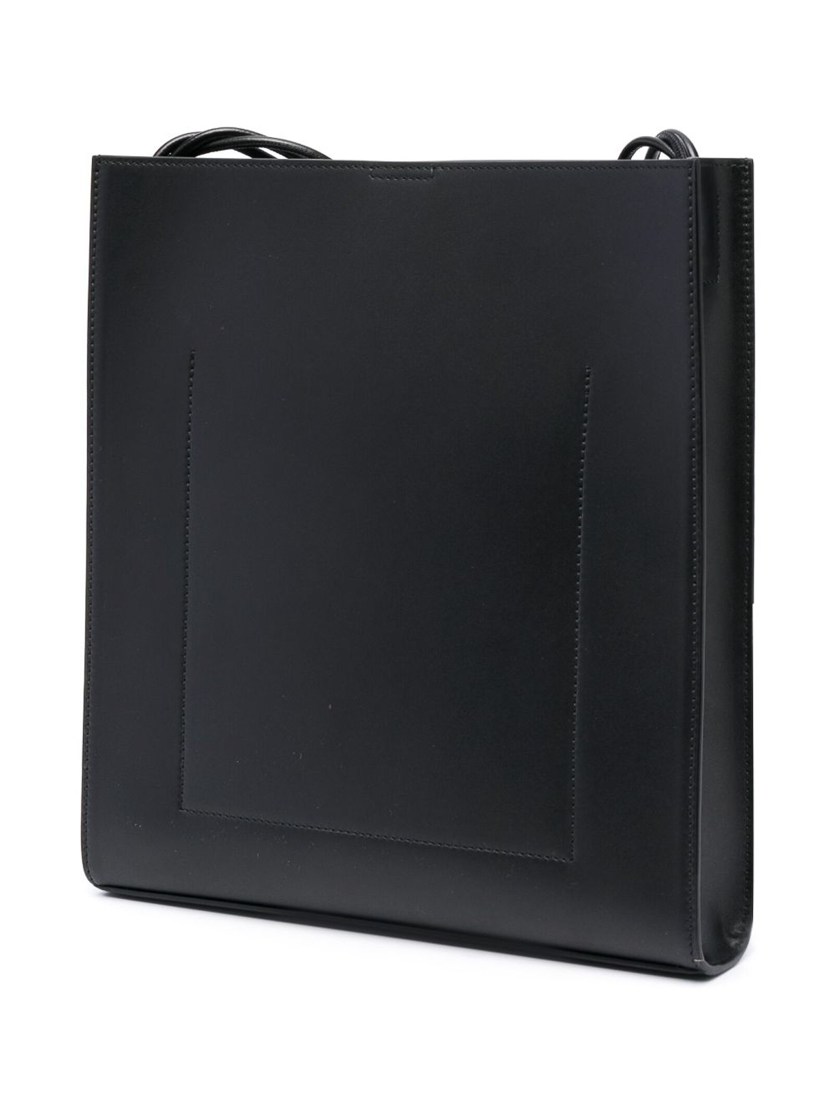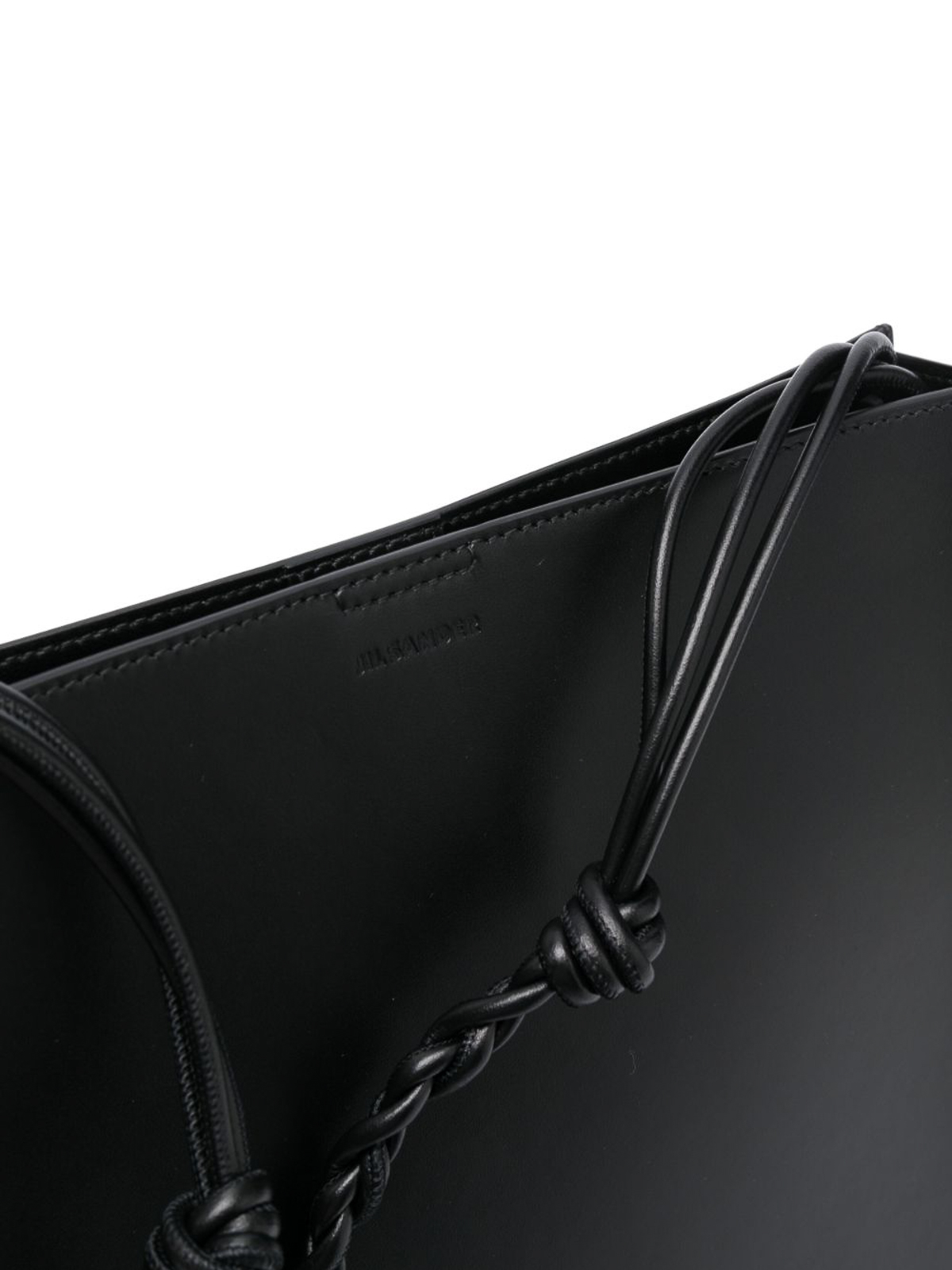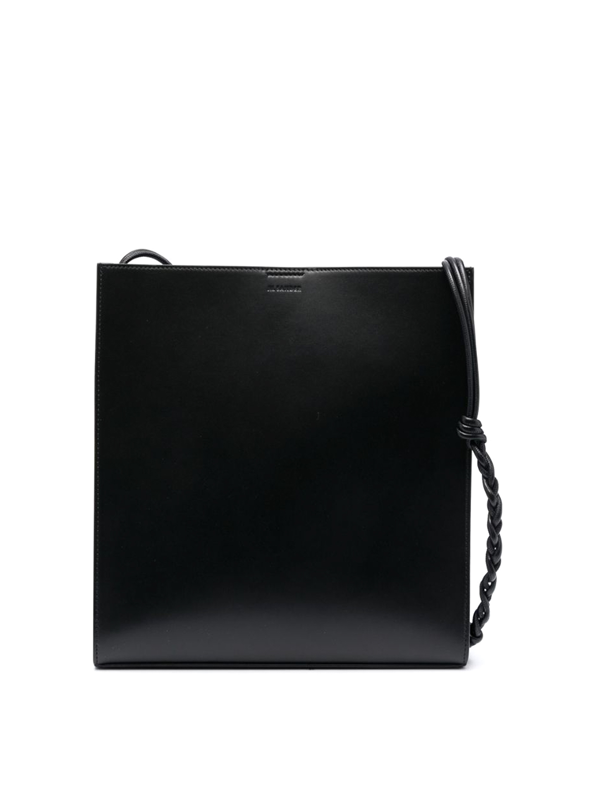 Black medium tangle leather shoulder bag from jil sander featuring black calf leather nappa leather polished finish embossed logo to the front embossed internal logo tonal stitching rectangle shape magnetic fastening single braided shoulder strap internal patch pockets and main compartment