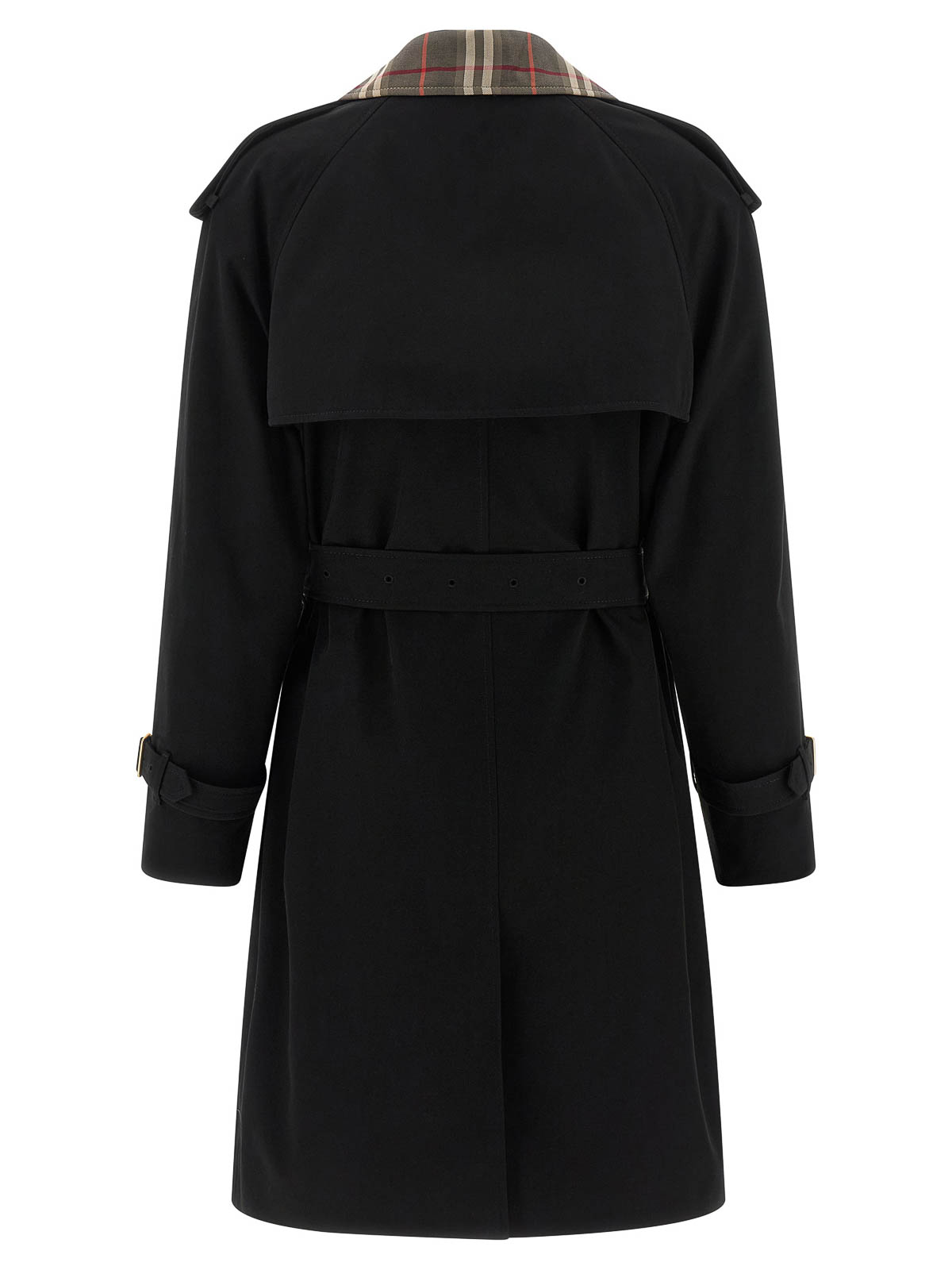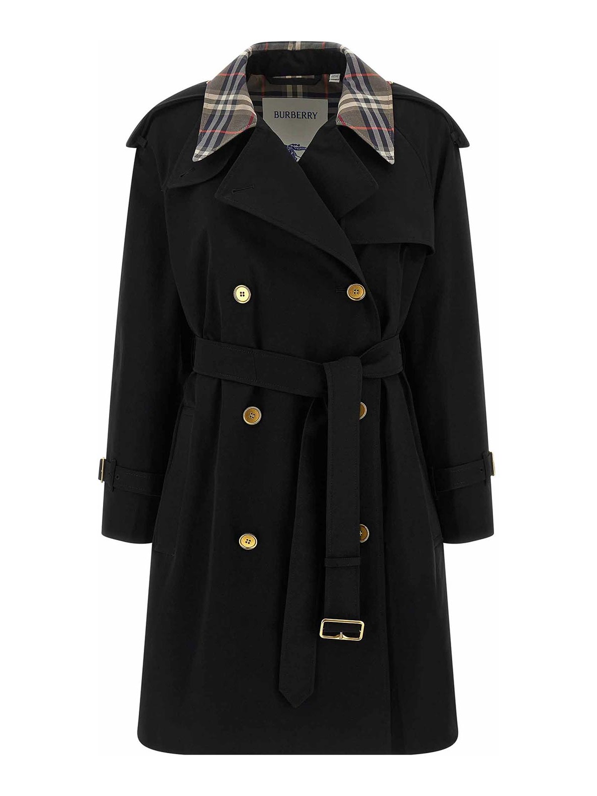 Medium 'castleford' water-repellent cotton gabardine trench coat with burberry check lining and collar, double-breasted style with front button closure, removable chin strap, long sleeves with adjustable strap, pockets, cape and back split, shoulder badges, removable belt.