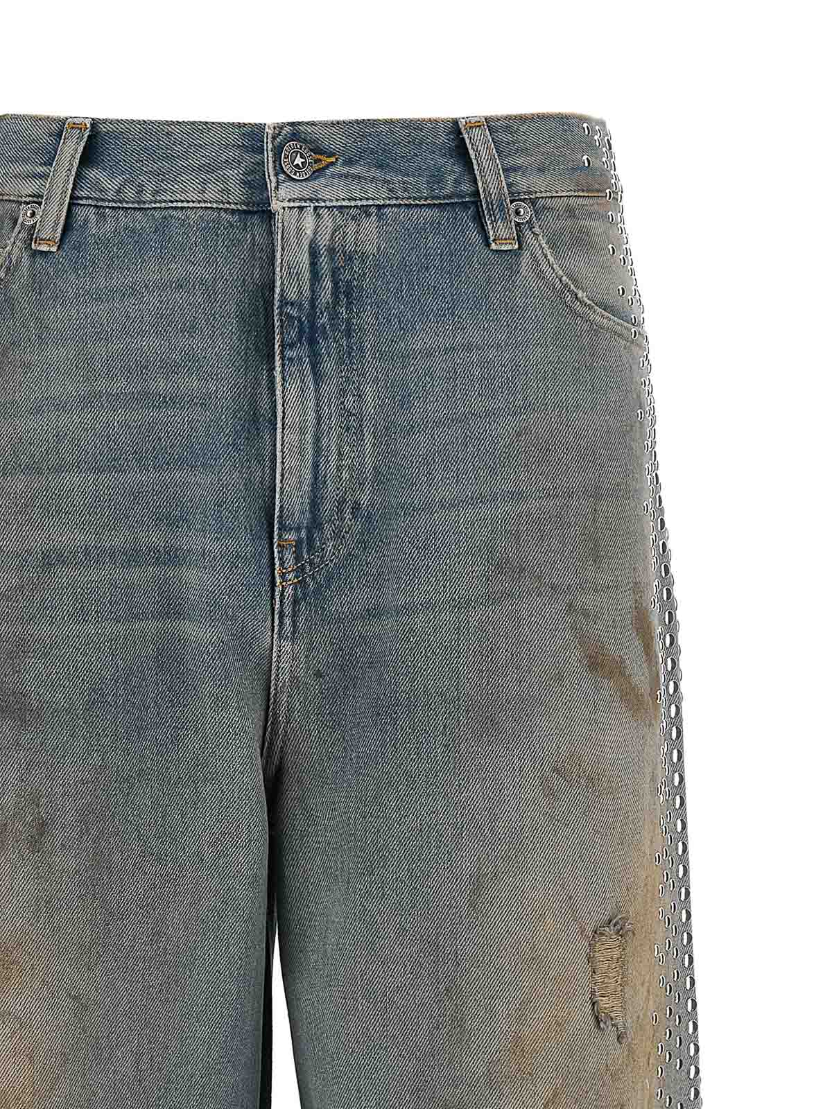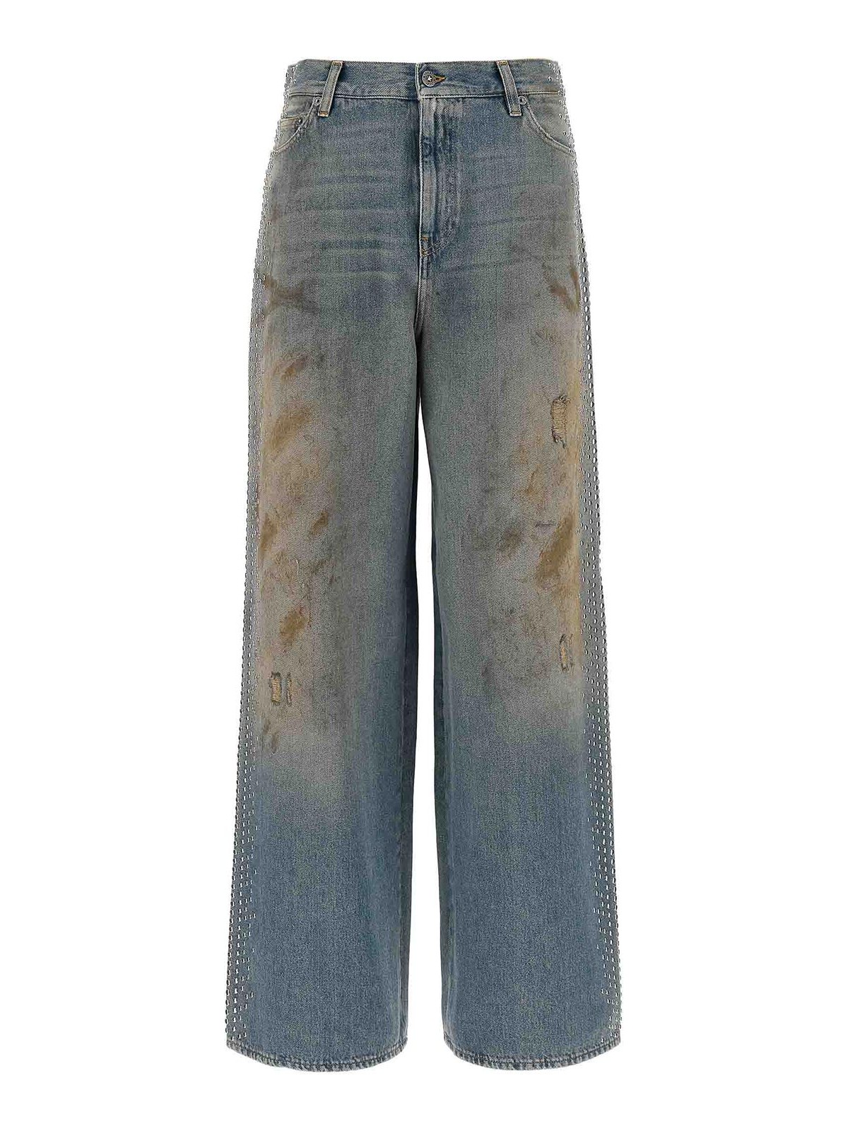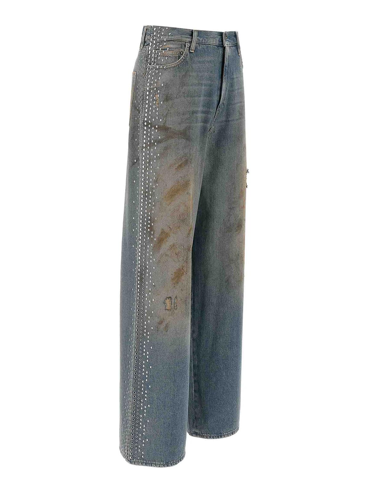 melody' cotton denim jeans officina wash with side flat studs, wide and straight leg, front zip and button closure, five pockets, back trompe l'oeil logo tag.
