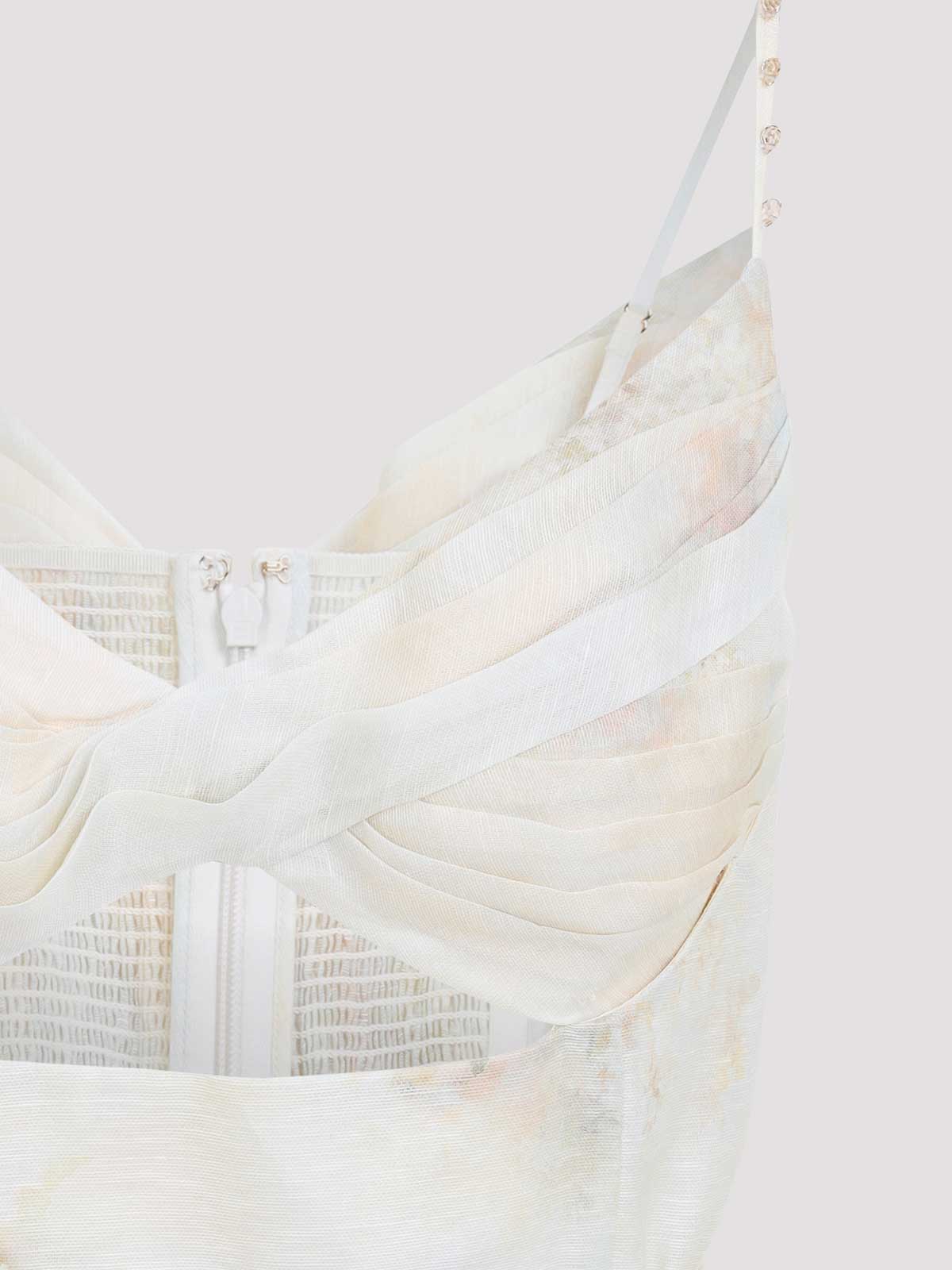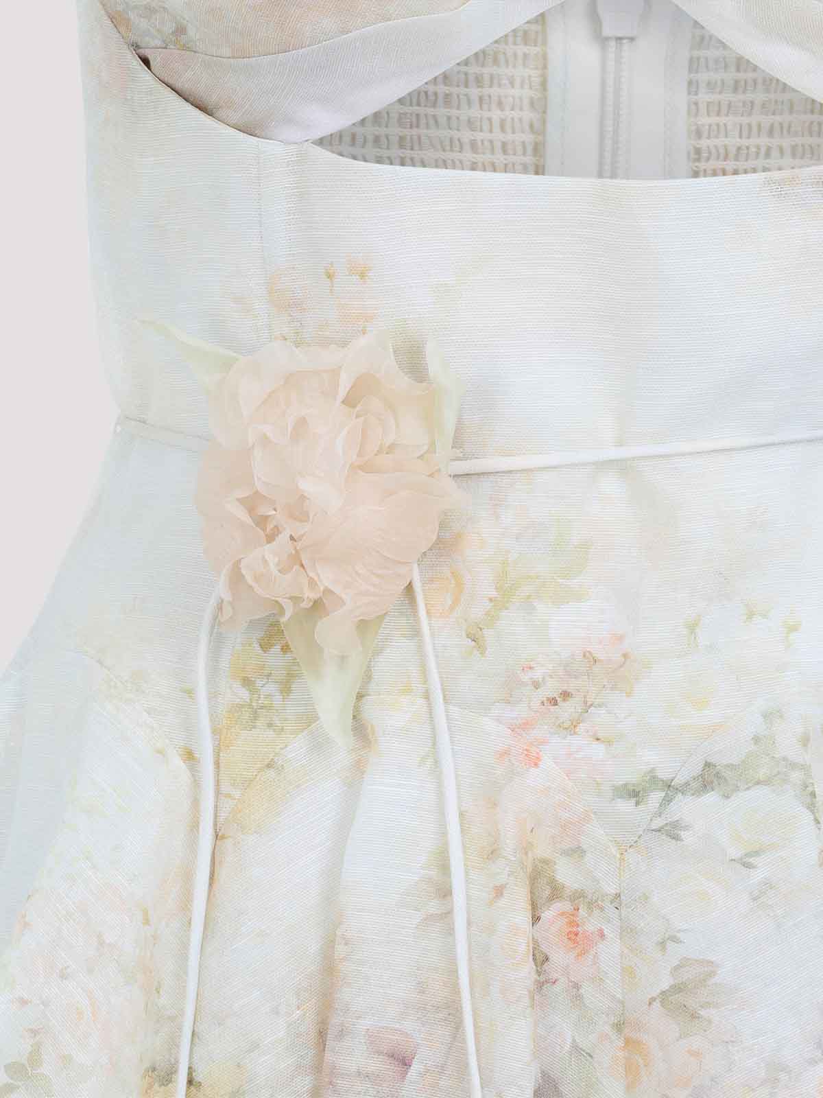 Zimmermann memento twist white and mini dress crafted from white and blend seasonal floral print fine straps v, neckline pleated twisted bodice cut, out on the fitted waist with detachable rouleau belt smocked and concealed zip at the back flared skirt beads embellishment at the straps and hem lined
