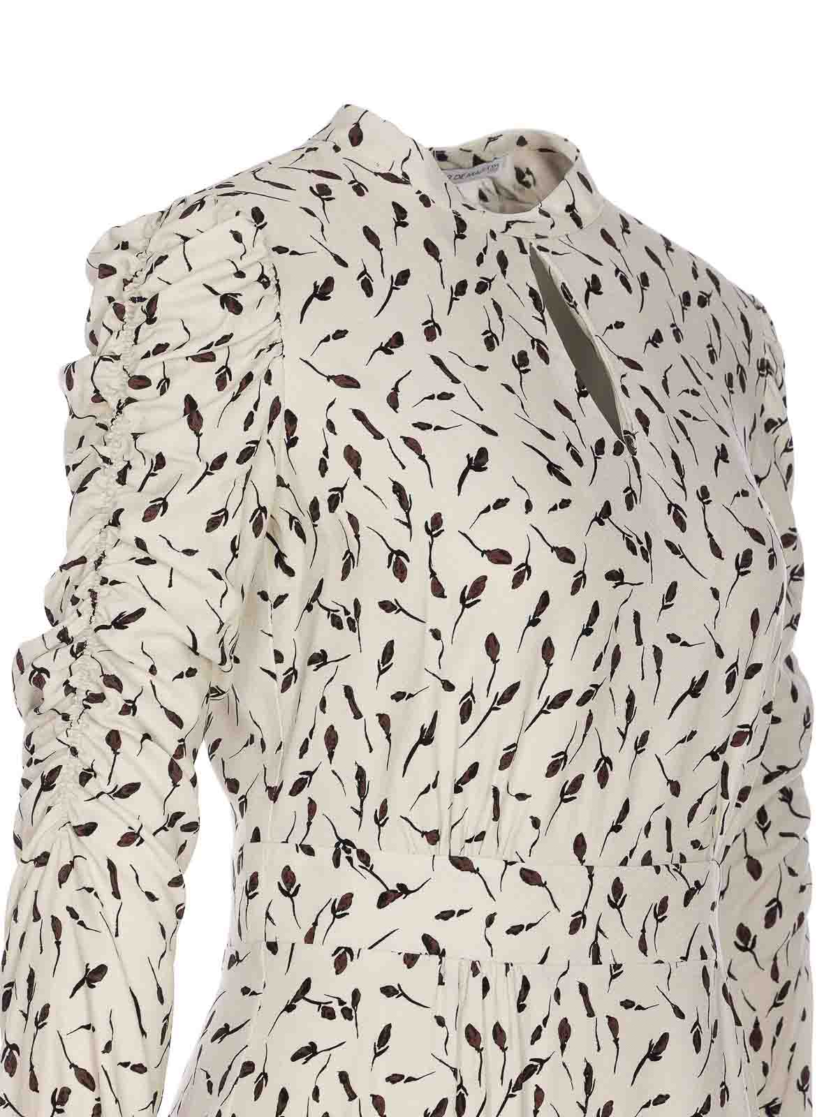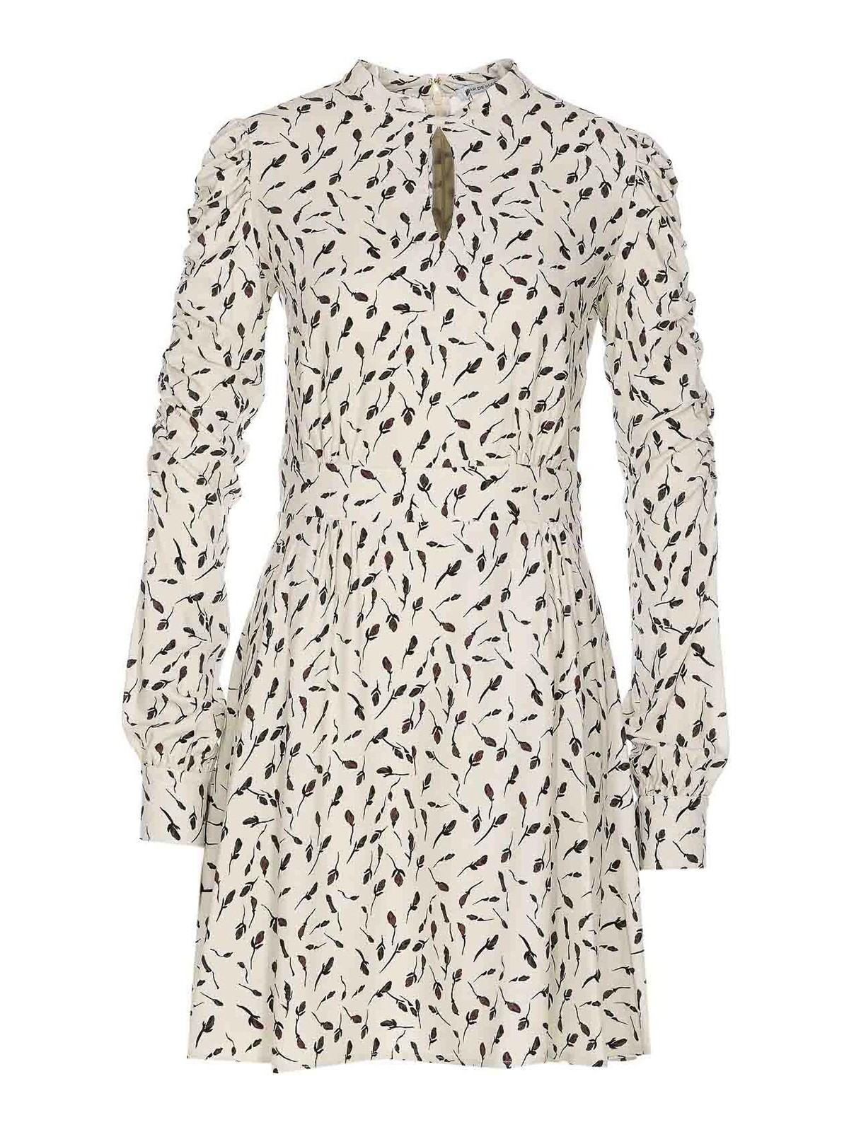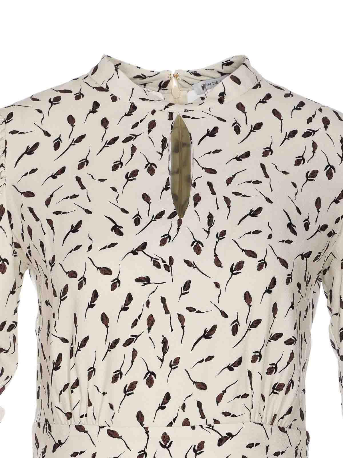 Mar de margaritas light green dress, cut out detail on front, long sleeves, short model, zip closure on back, patterned