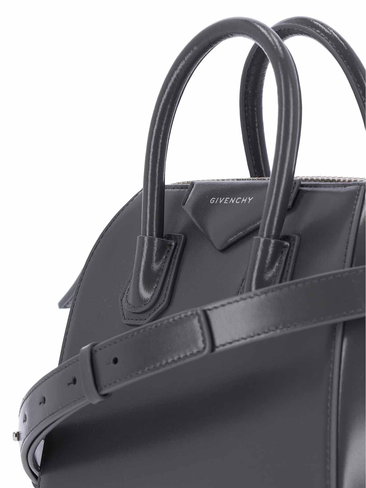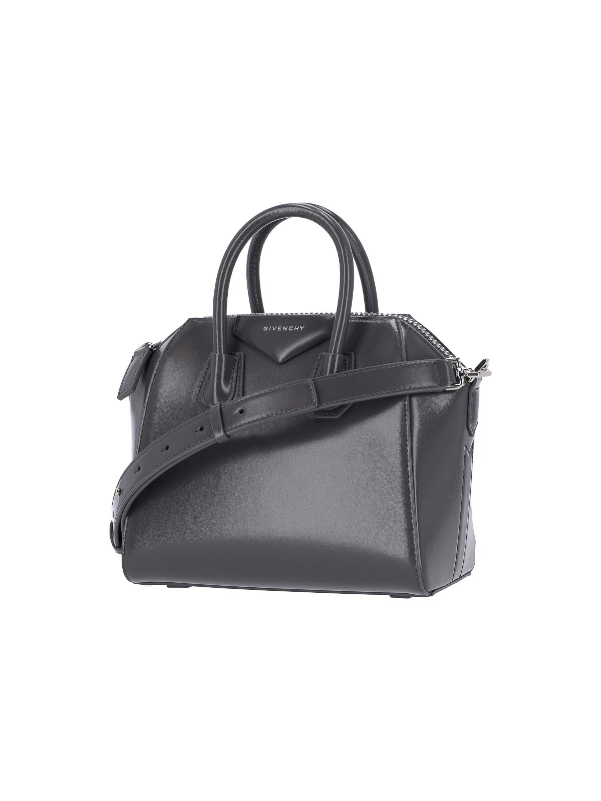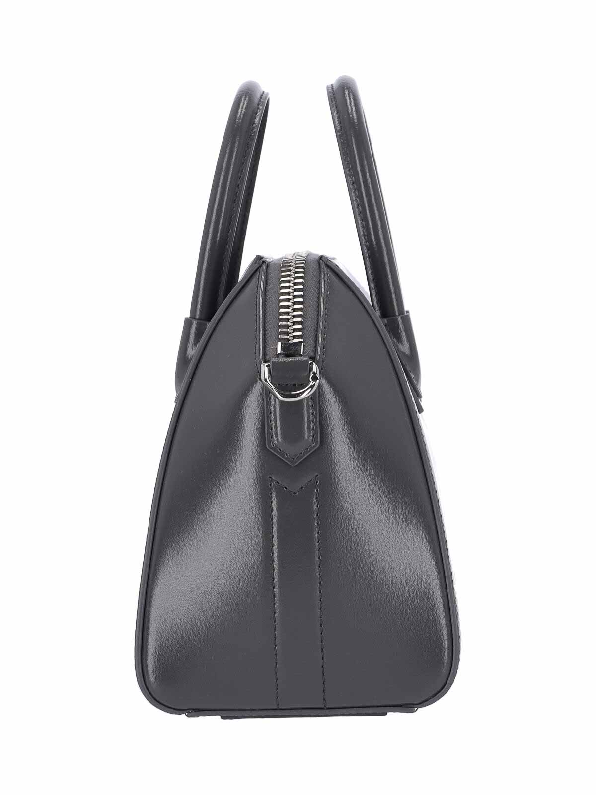 Givenchy antigona mini bag in gray calfskin, dark shade, two top handles, zip closure, adjustable and removable shoulder strap, front metal logo, one internal zip pocket, one main internal compartment.