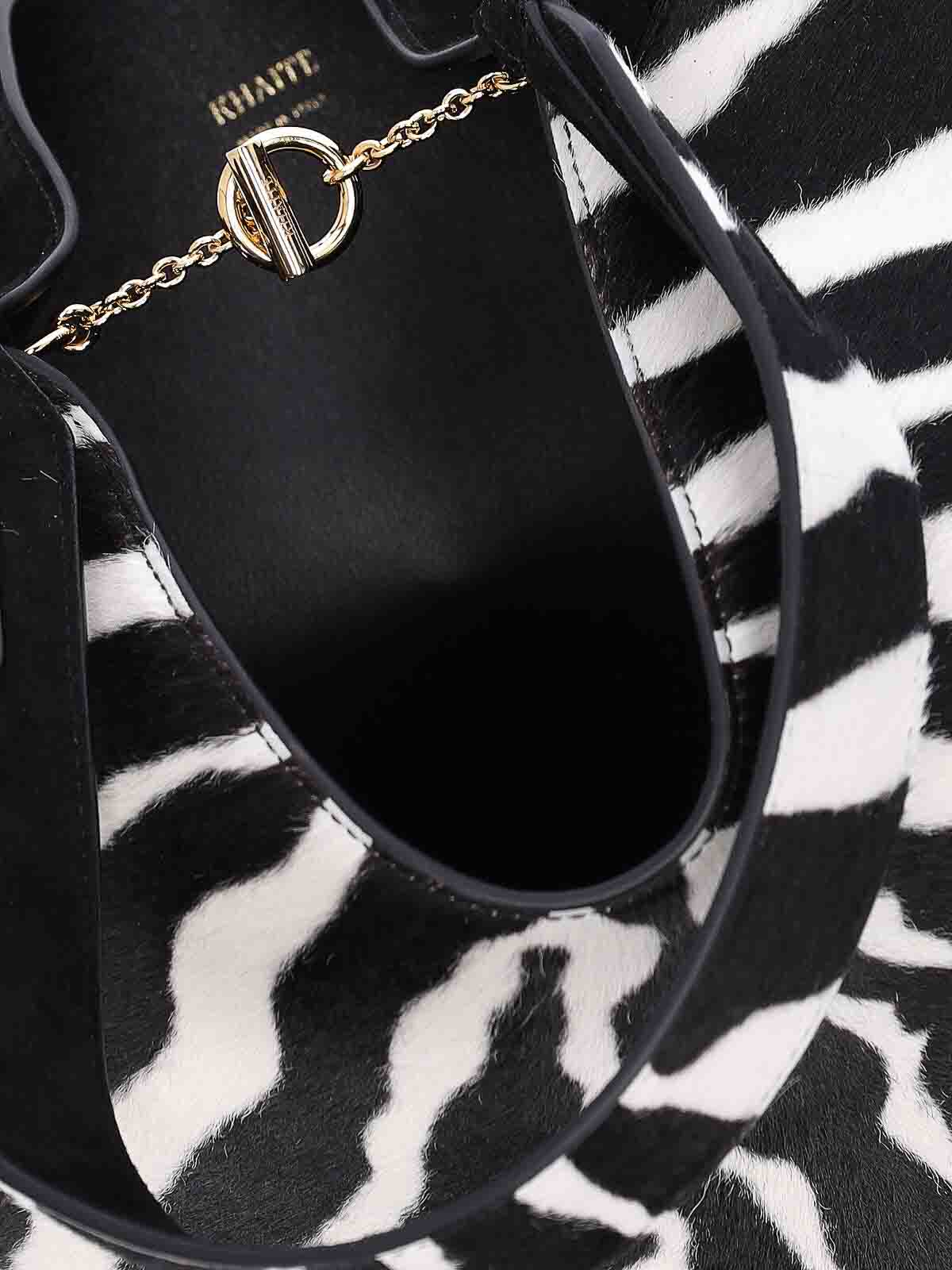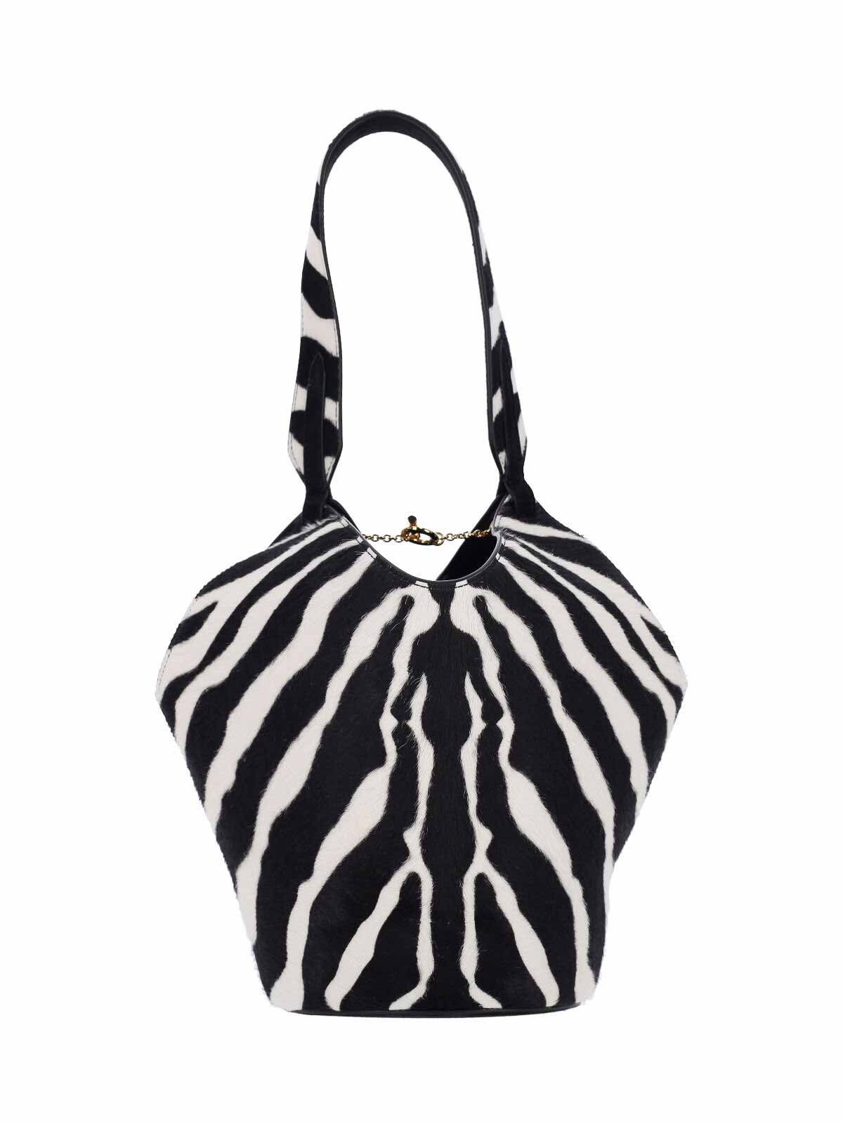 Mini lotus khaite bag in black calfskin on the front, animalier motif on the back, one top handle, golden metal chain and hook closure, golden logo embossed on the front, one main internal compartment.