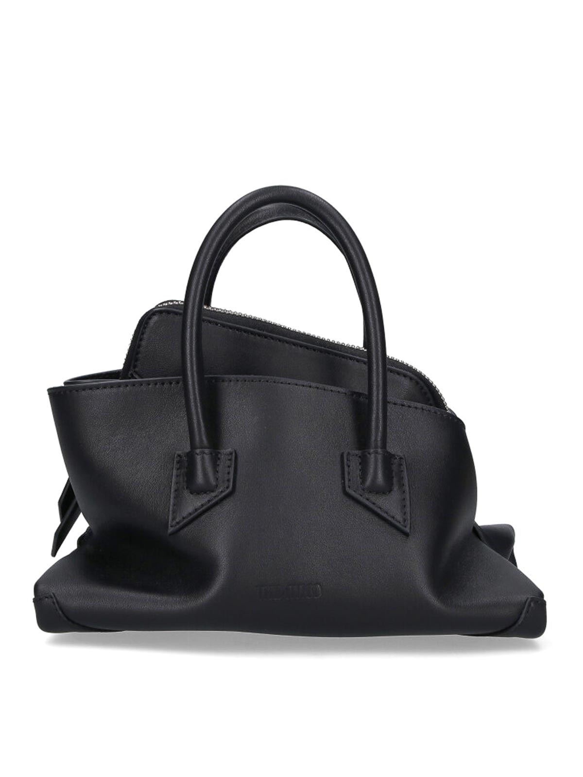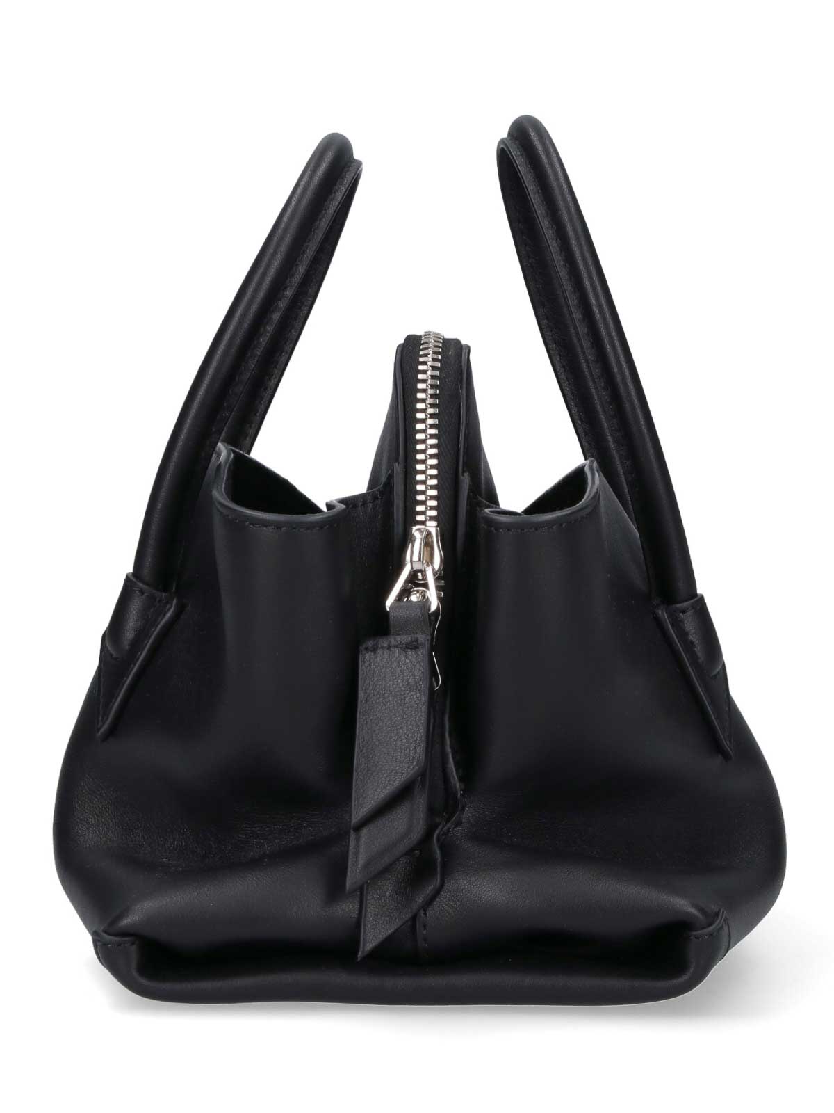 The attico mini la promenade bag, in black calfskin, two top handles, adjustable and removable shoulder strap, double zip closure, leather zipper detail, tone-on-tone engraved logo on the front, one internal card slot, three main internal compartments.