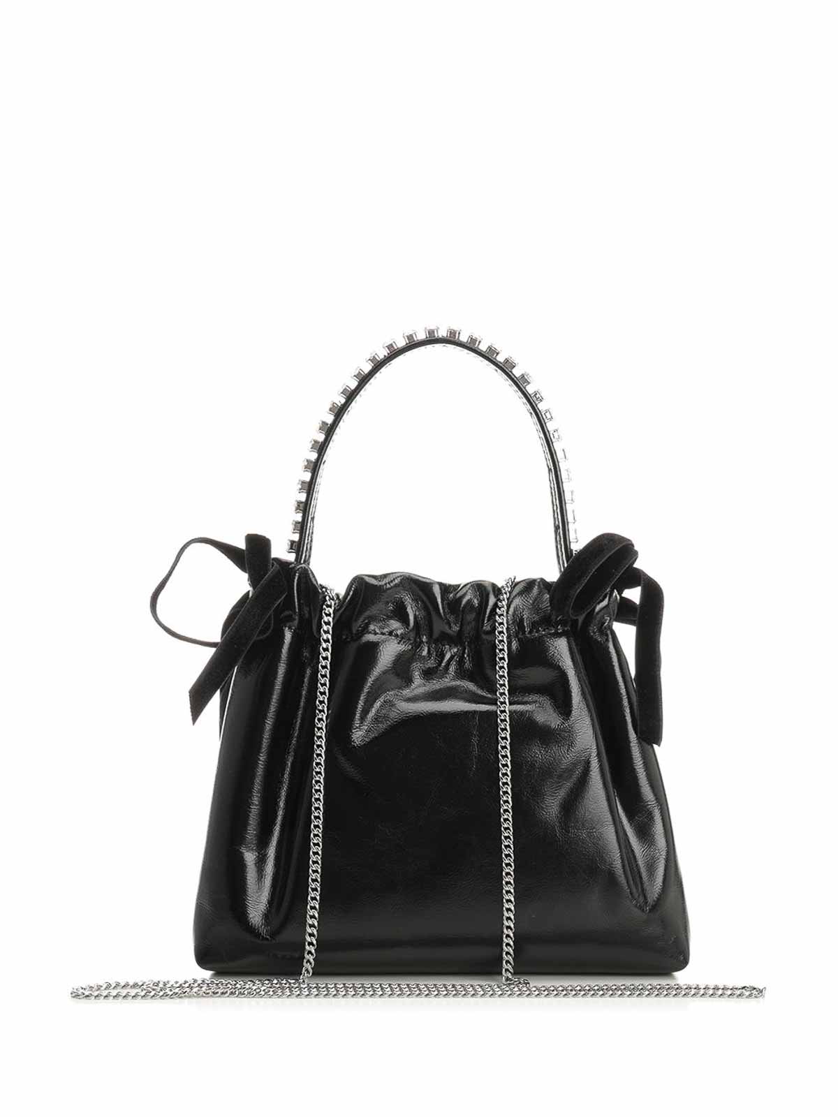 Mini drawstring bag in shiny with removable chain shoulder strap and gathered