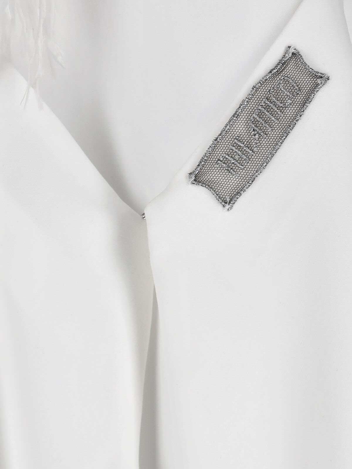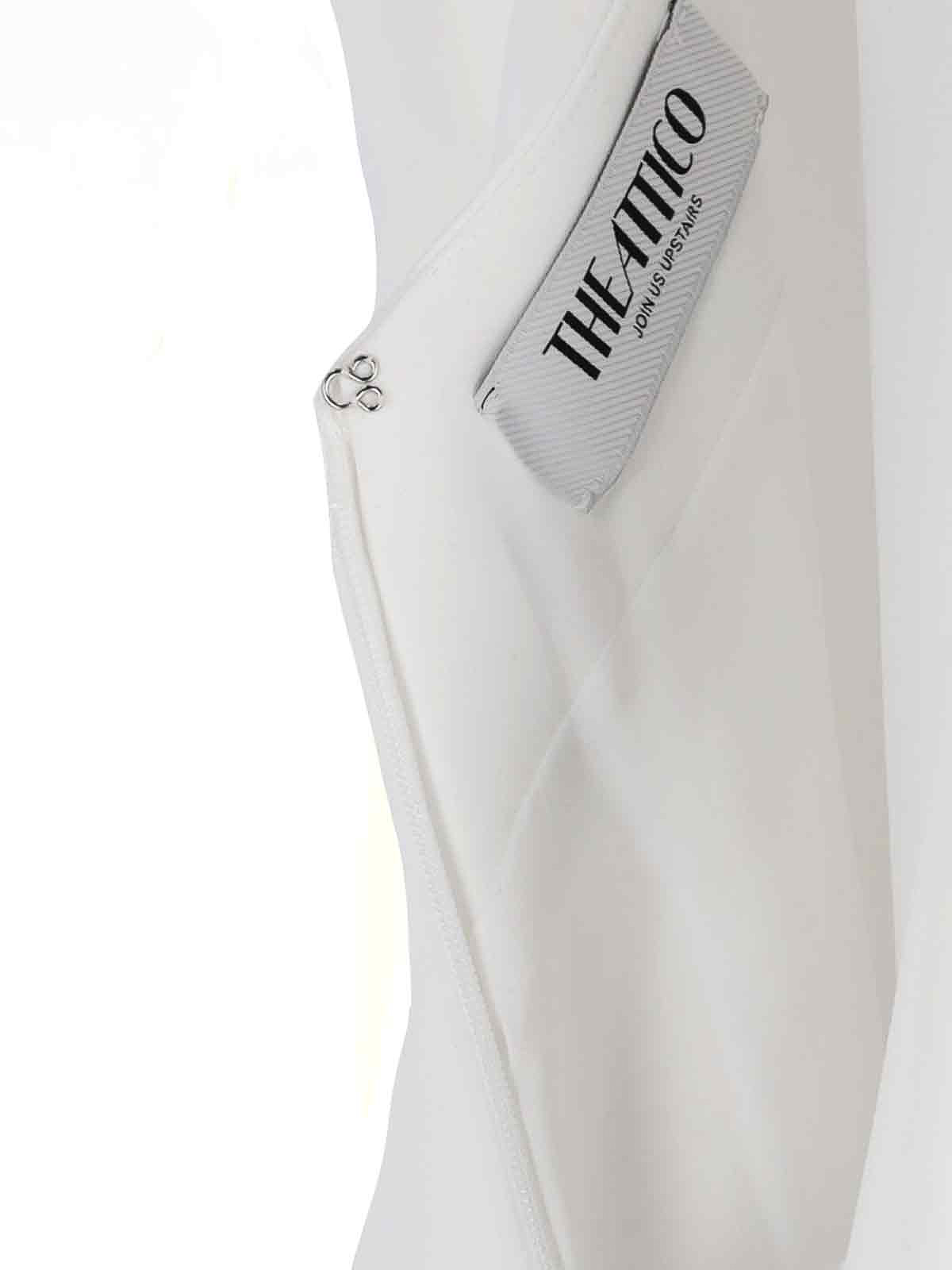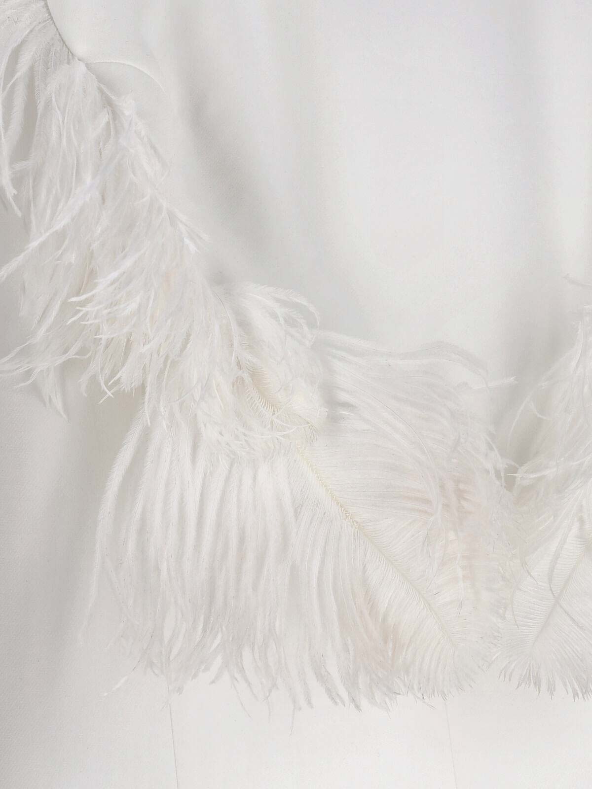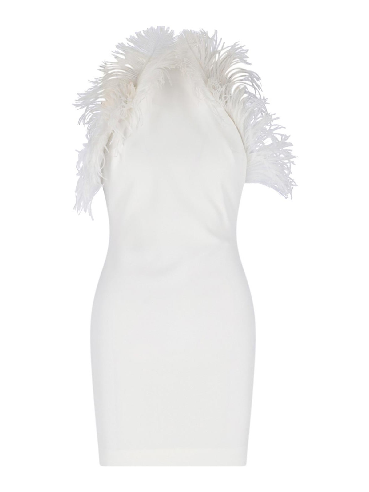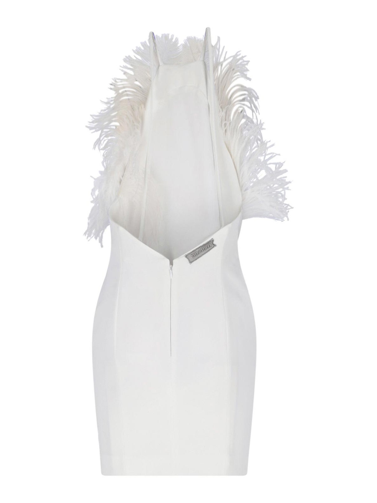 The Attico feather mini dress in white cady fabric, back zip closure, thin straps, back neckline, tone-on-tone feather detail on the front, back logo tag, straight hem.