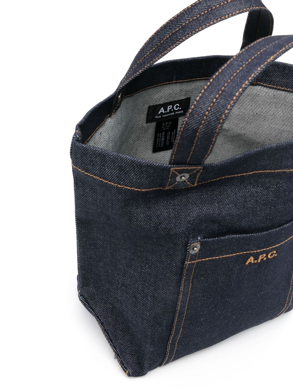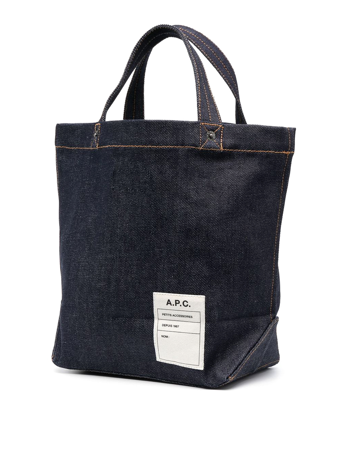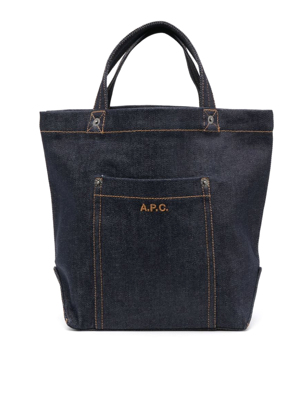 The mini tote bag by apc in thais denim in indigo blue composed of a cotton blend denim fabric with contrast stitching features a front patch pocket an embroidered logo on the front a logo patch on the back a top opening a main compartment a logo patch inside and two long top handles