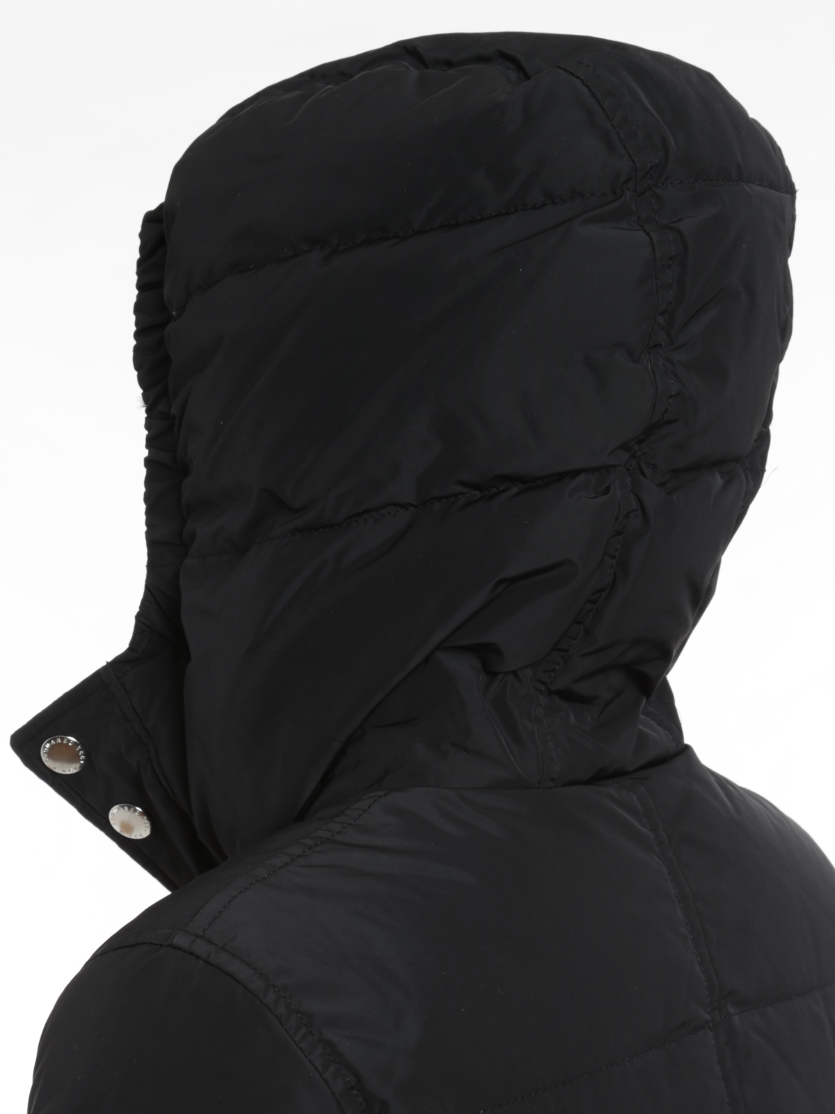 Technical fabric jacket featuring a goose down interior, turtleneck, hood, zip button fastening, multiple zip pockets and flap snap pockets at the front.